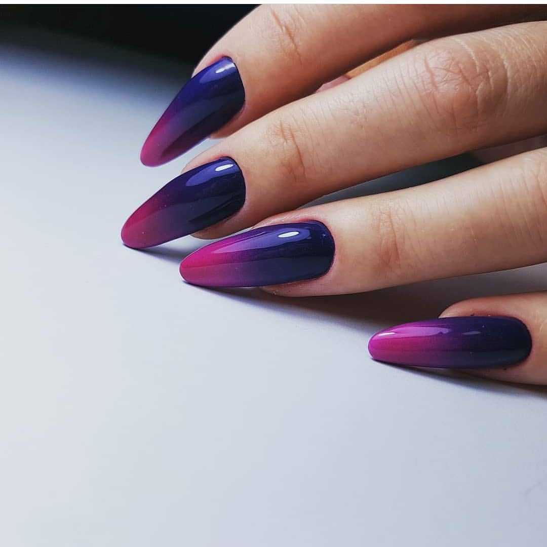 Форма миндаль – неизменная классика маникюра. Она отлично сочетается с любым оттенком из фиолетовой палитры – от пастельного до почти чёрного. Особенно эффектные варианты нейл-арта – кошачий глаз, омбре, френч.