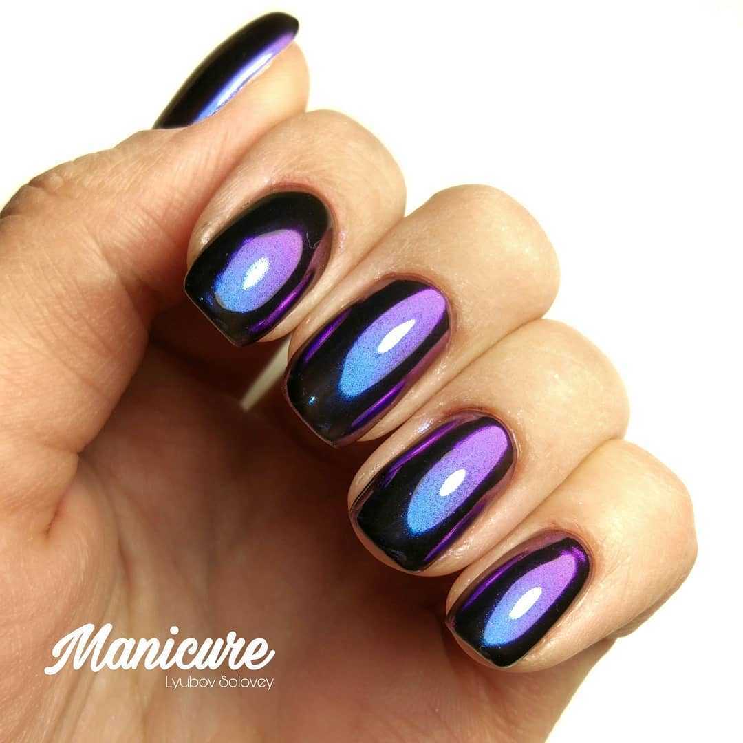 Такой дизайн выполняется с помощью особого лака с металлическими частицами. После поднесения магнита они красиво распределяются по поверхности и формируют необычный рисунок. Обычно для получения таинственного нейл-арта используют магнитный лак тёмно-сиреневого оттенка.