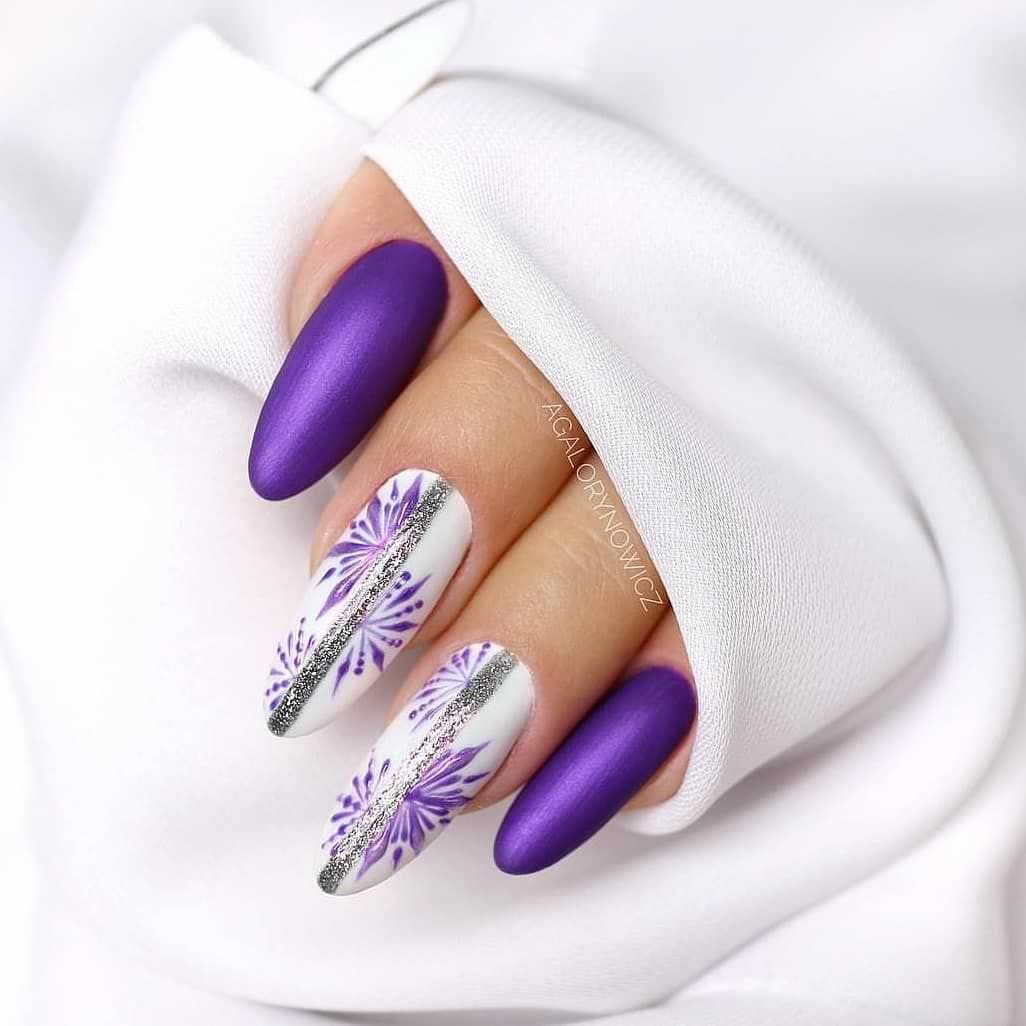 Сочетание белого и фиолетового отлично смотрится с цветочными мотивами, лунным светом и французским дизайном, стильной геометрией и рисунками в технике негативного пространства.