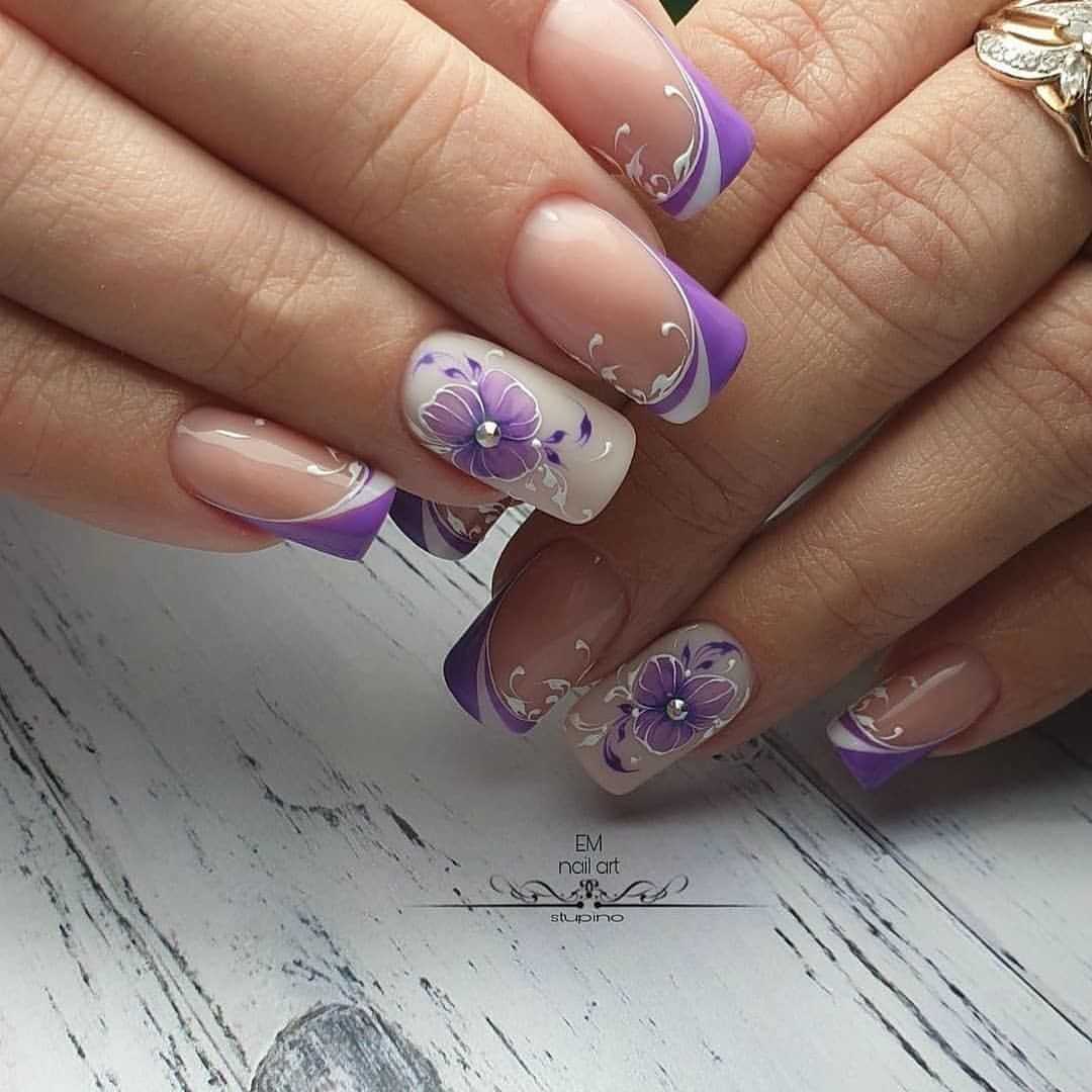 В качестве дополнительного оттенка выбирайте любые нюдовые тона, белый, различные оттенки фиолетового. Цветочные мотивы располагайте на 1-2 пальцах руки, например, на среднем и безымянном. Остальные ноготки украсьте фиолетовым френчем. Для дизайна рекомендуется использовать овальную “улыбку”. Не стоит экспериментировать с треугольной или другой необычной формой на столь насыщенном цвете, как фиолетовый.
