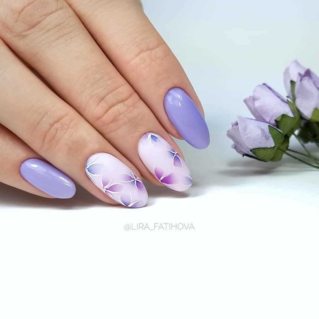 Для коротких ноготков овальной формы хорошо подойдёт однотонный дизайн. Не возбраняется его дополнение цветочками, минималистичными рисунками. На длинных ногтях лучше всего смотрится градиент в оттенках сирени.