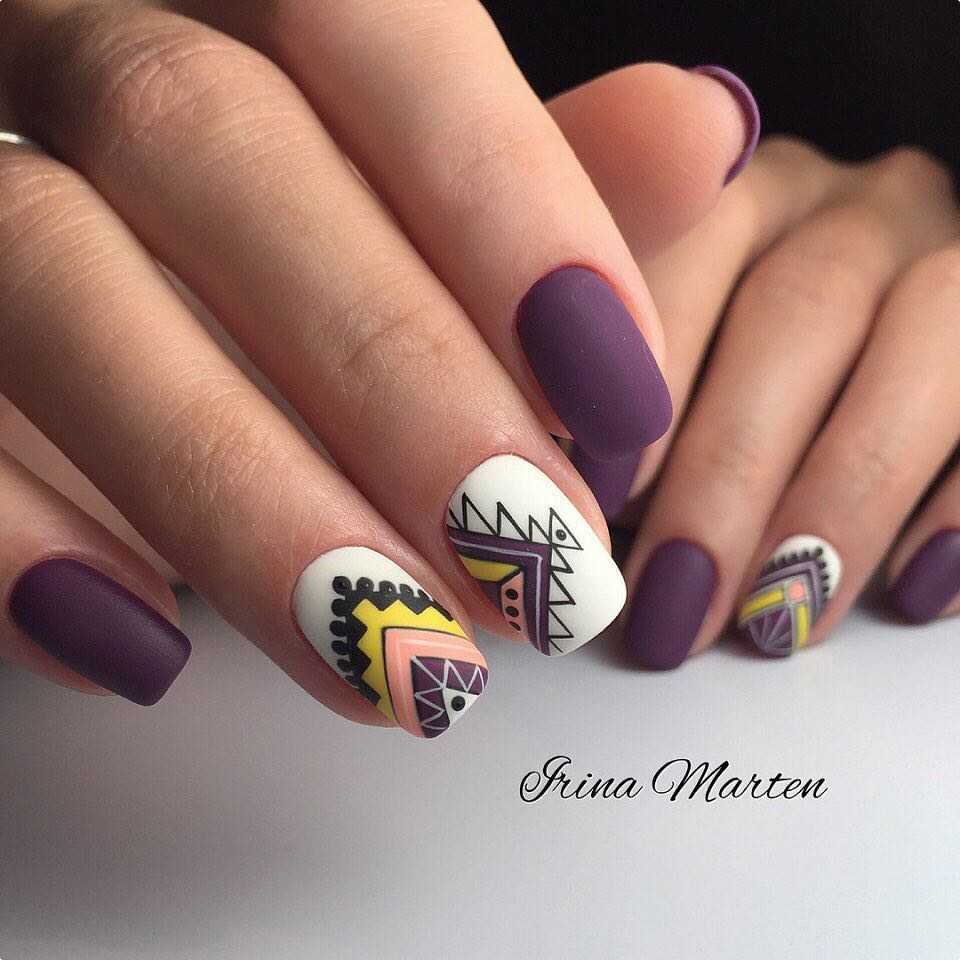 3. Эти фиолетово-белые ногти с этническим узором сделаны с использованием стемпинга.