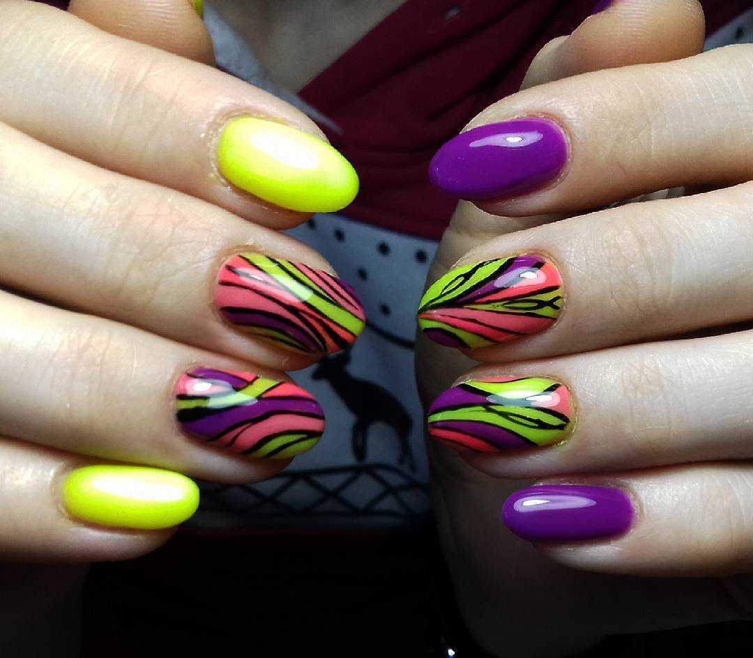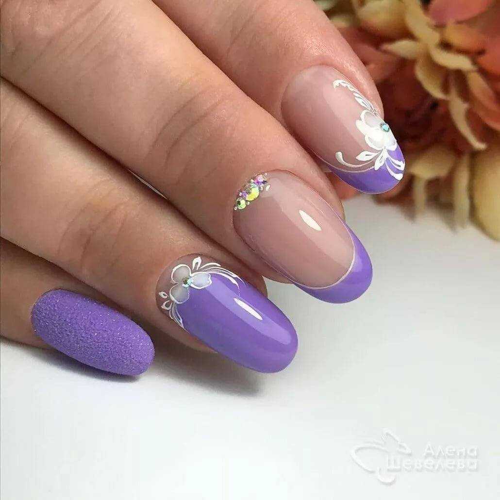 Двух- или многоцветный сиреневый маникюр украшают геометрическими, флористическими или животными принтами, блестками и фольгой. Эффектно будет смотреться градиент, а также цветной френч.