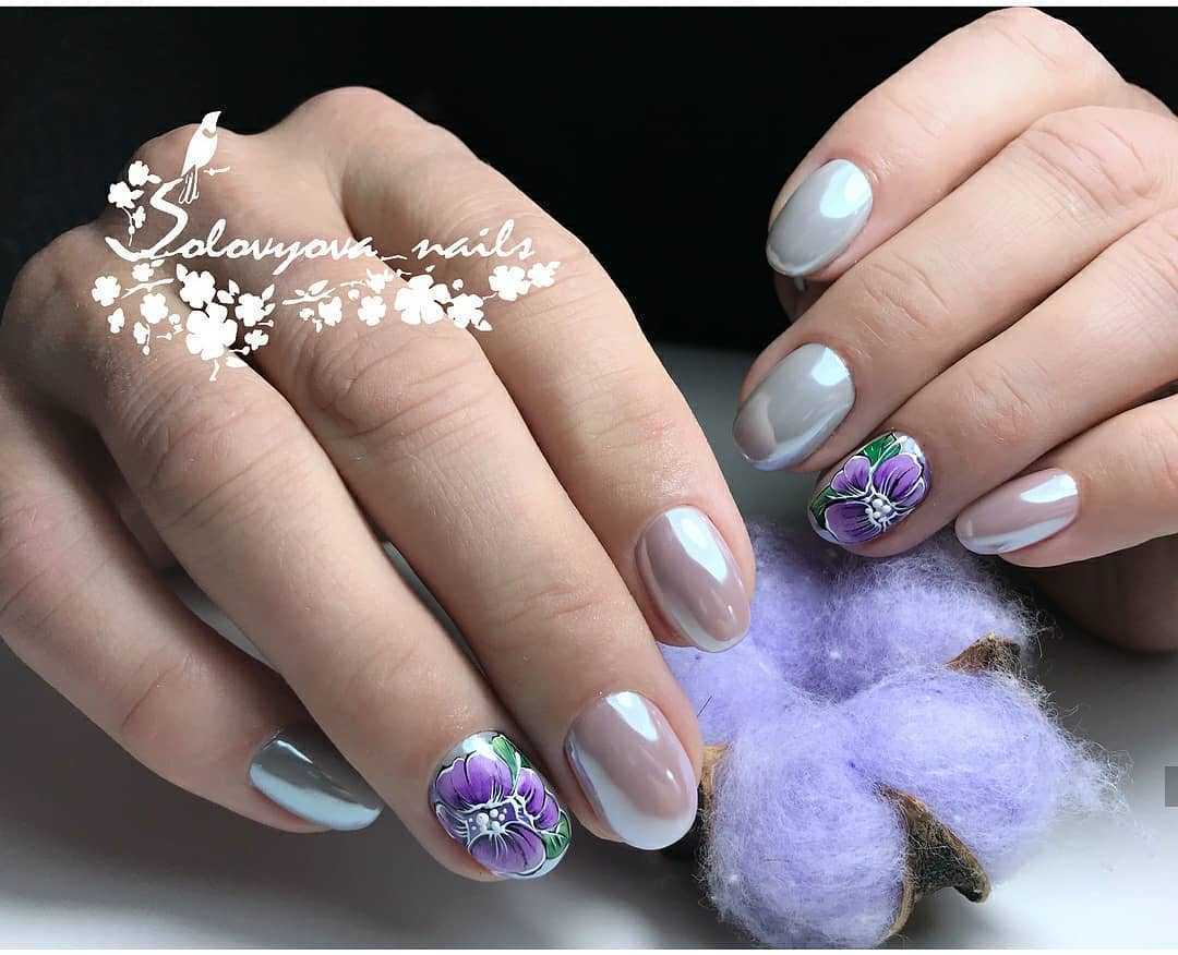 Для круглой формы часто выбирают однотонный сиреневый маникюр, украшенный цветочными принтами и абстрактными рисунками, а также градиент с переходом в другой цвет.