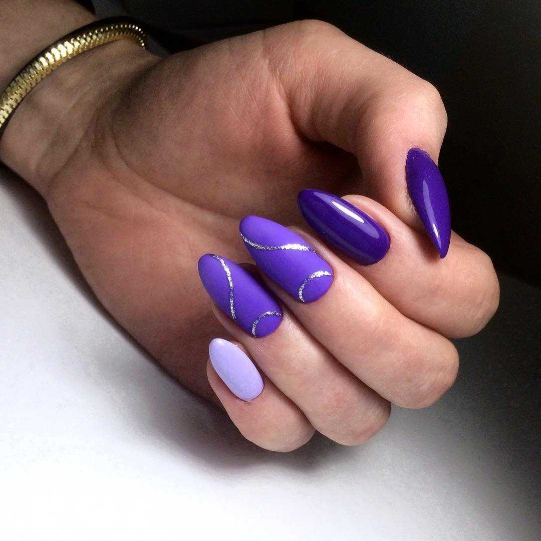 По-прежнему актуальны узоры в минималистическом стиле. Это может быть одна тонкая полоска по вертикали в контрастном цвете на фиолетовом фоне. Можно нарисовать понравившуюся геометрическую фигуру на одном из пальцев. Не стоит отказываться от серебристых акцентов.