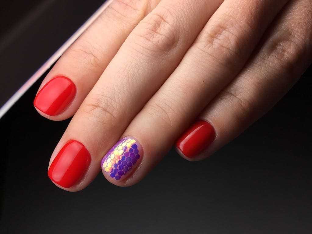Голография удачно сочетается с покрытиями как насыщенных оттенков, таких как ярко-красный, бордовый, винный, так и с приглушенными тонами. Такой маникюр в красных тонах станет удачным выбором для лета.