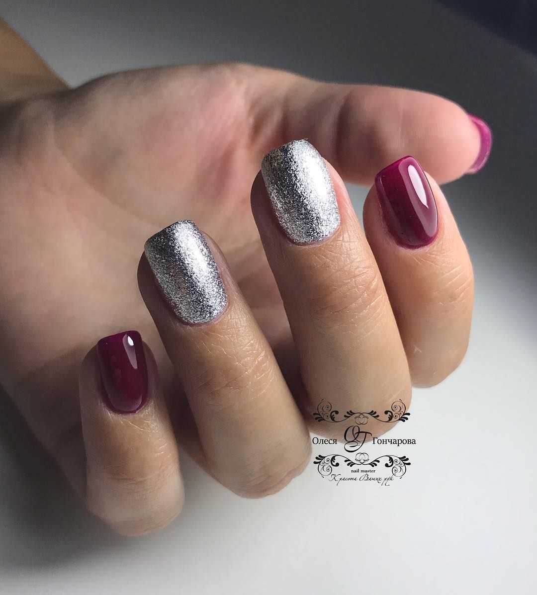 Интересным решением для коротких ногтей станет сочетание яркого цвета с нанесением серебряного лака на отдельные ноготки, а для особых случаев подойдет сияющий зеркальный маникюр.