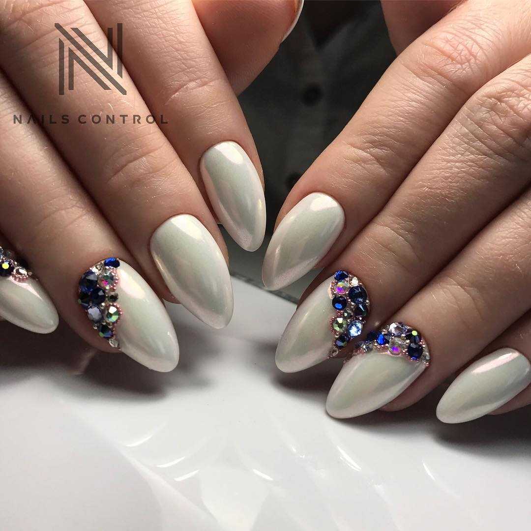 Нежный белый маникюр очень часто дополняют при помощи жемчужной втирки. Такой нейл-арт привлекает своей нежностью и лаконичностью. Стразами лучше всего украсить прикорневую зону ногтевой пластины. Например, простая геометрия прекрасно дополнит дизайн. Маникюр с использованием втирки и страз наибольшей популярностью пользуется в летний и зимний период. В моде французский и лунный маникюр, однотонное покрытие втиркой, нейл-арт с дополнением кружевного декора. Белый маникюр с втиркой также можно дополнить и более сложным декором, например, лепкой, шармами, конусами или стразами крупного размера.