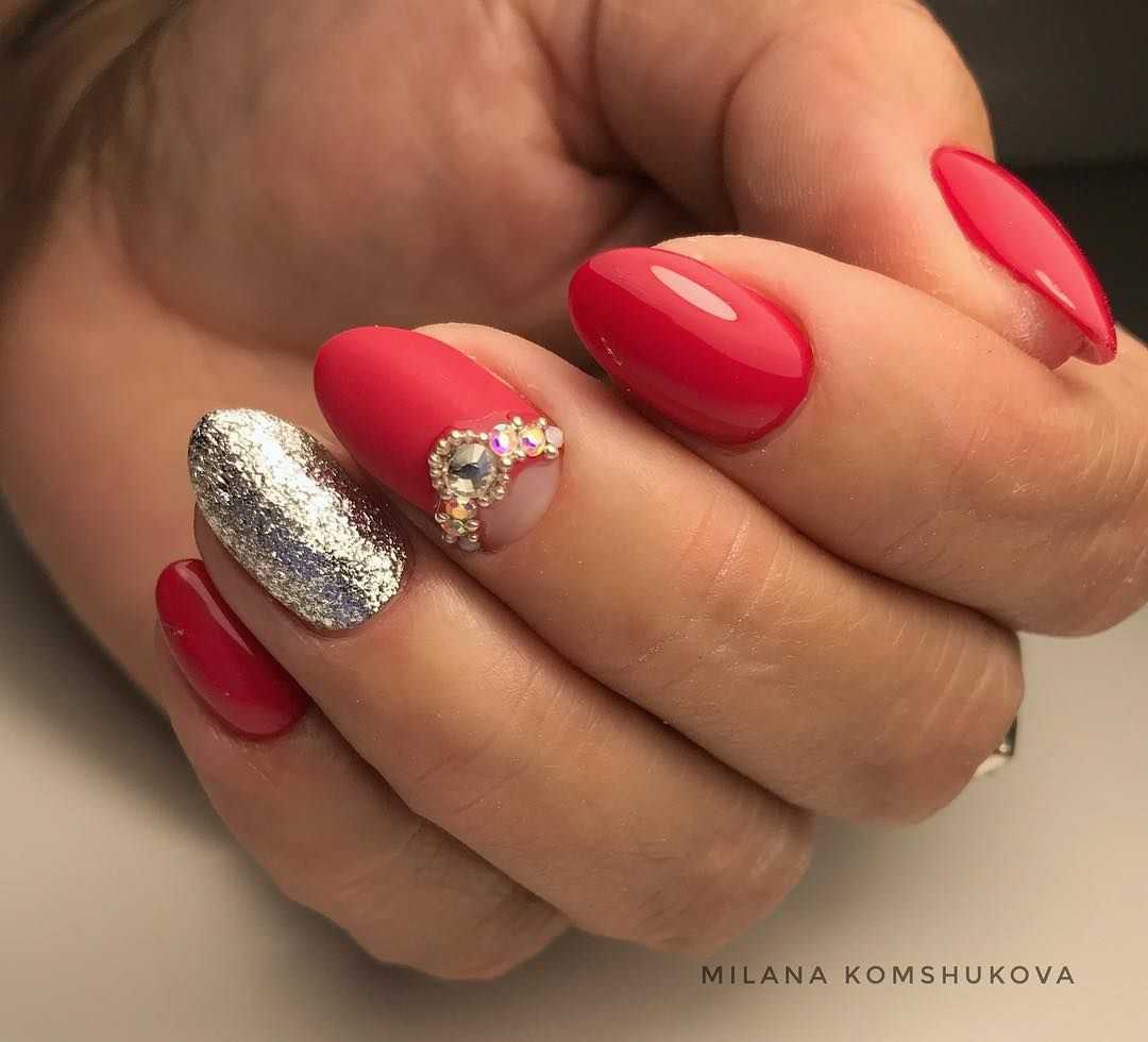 В качестве основы лучше подбирать более глубокие красные оттенки, поскольку за счет этого ногтевая пластина визуально удлиняется. В качестве декора лучше всего добавить геометрический рисунок из блестящих полосок, либо выложить стразы или бульонки по диагонали ногтевой пластины.