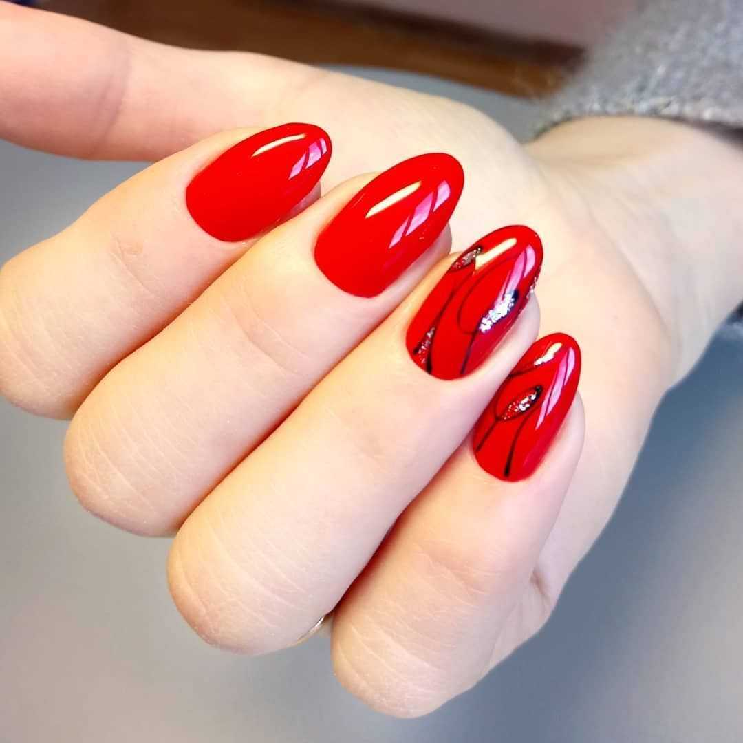 Основным фаворитом красного маникюра гель-лаком станет тематическая роспись нескольких ноготков в сочетании со скромными и сдержанными остальными ногтями.