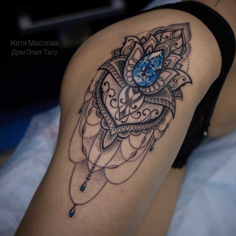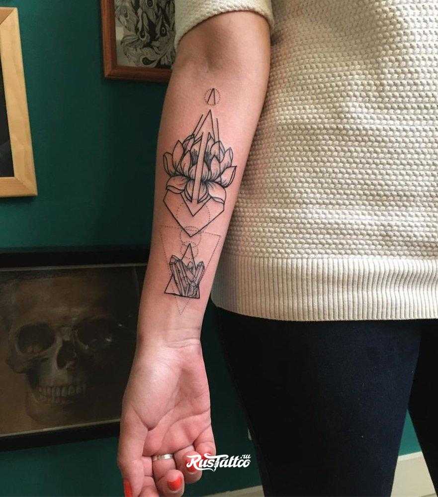 Немалым успехом пользуются геометрические татуировки «Индийский лотос». Чёрной краской наносят монохромное изображение. Такая татуировка выглядит наиболее ярко и прекрасно, причем смотрится оно эффектно на коже любой расы. Выбирать можно даже простой эскиз тату лотоса. Намного сложнее изобразить сюжетную татуировку, но оно того стоит. Судя по эскизам, они могут быть разных размеров: небольшие или же занимать большую площадь на вашем теле. Очень популярными сюжетами являются, например, потерявшийся слон в цветах лотоса или Будда с цветком. Также прекрасно будет смотреться лотос посреди озера и чарующее в треугольнике.