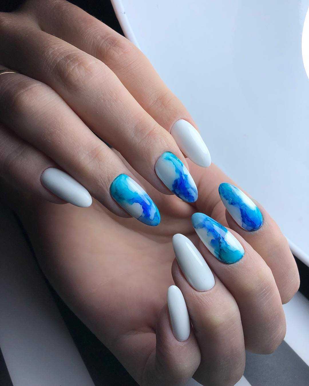 Размытые, полупрозрачные узоры смотрятся нежно и даже мило. Такой маникюр в 2023 году особенно хорошо подходит к миндальной форме, добавляет свежести. В основном на миндалевидной форме акварельные узоры делают в виде: