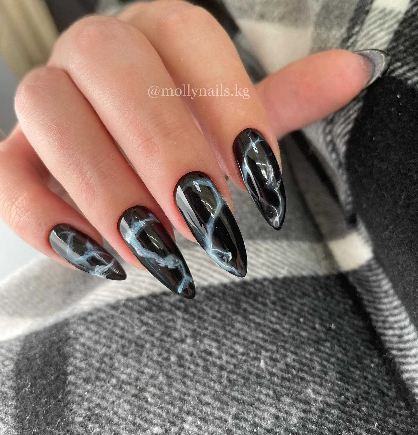 Мрамор — один из самых благородных и элегантных дизайнов маникюра, который особенно стильно смотрится в исполнении черного цвета. При этом ты можешь выбрать один из нескольких вариантов использования этого цвета: либо сделать бело-золотые разводы на черном фоне, либо наоборот, заполнить светлый бэкграунд серо-черными узорами. Кстати, мрамор — не только один из самых элегантных, но также один из самых простых в исполнении дизайнов.