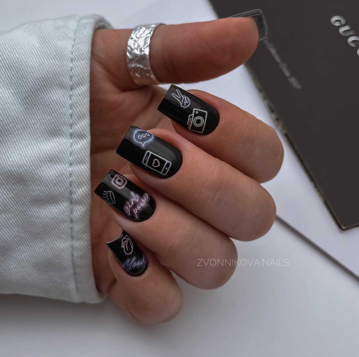 Каким бы стильным и самобытным ни был простой черный цвет, он всегда смотрится еще лучше в сочетании с актуальным дизайном. Современные тенденции нейл-арта таковы, что сегодня можно смело выбирать абсолютно любой вариант. В моде самовыражение, так что какое оформление ногтей ты бы ни выбрала, попадешь в точку. А мы поможем тебе легко и просто определиться с подходящим нейл-артом. Короткие, длинные, миндалевидные, овальные, скошенные и многие другие — впереди тебя ждут идеи черных дизайнов ногтей, которые дополнят все твои любимые наряды.