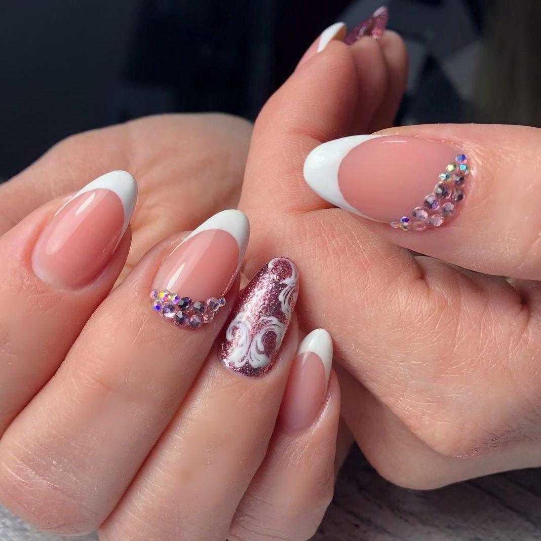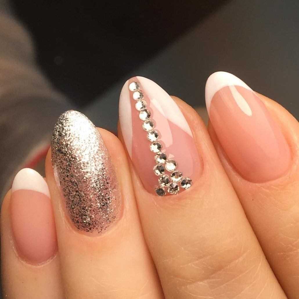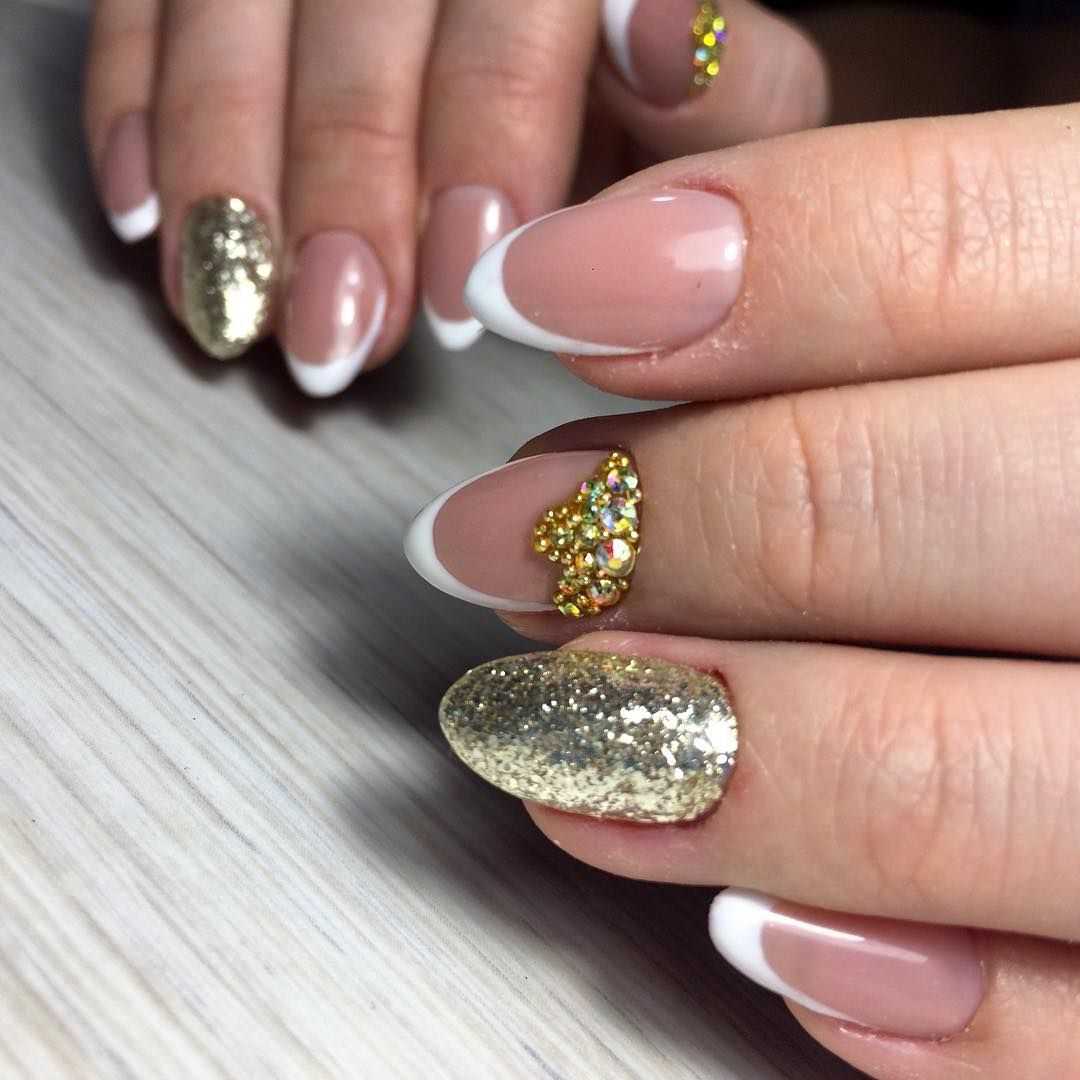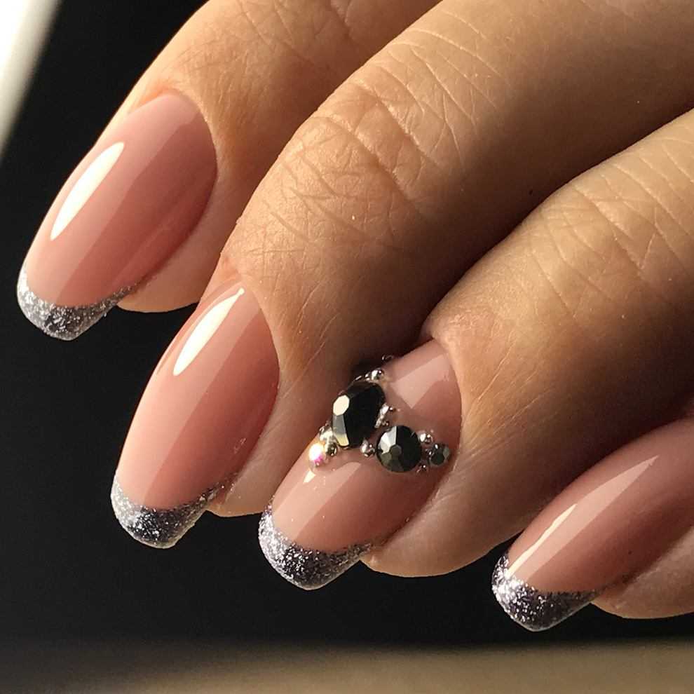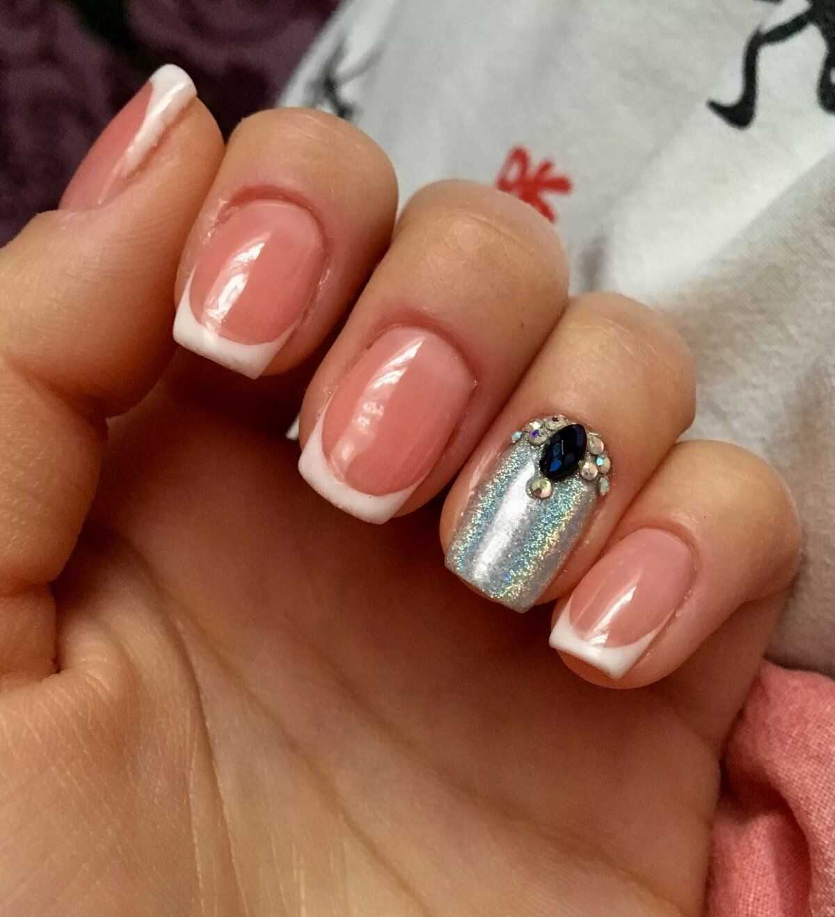 Блестки часто дополняют бульонками, стразами, камнями и другим объемным декором. В одном нейл-арте эти материалы смотрятся вполне гармонично и естественно. Если вы решили дополнить френч декором из страз, то отведите под него один из ноготков на руке. Это чаще всего безымянный палец. Его выбор вполне оправдан: безымянный палец реже используется в повседневном быту, при этом он практически всегда на виду.