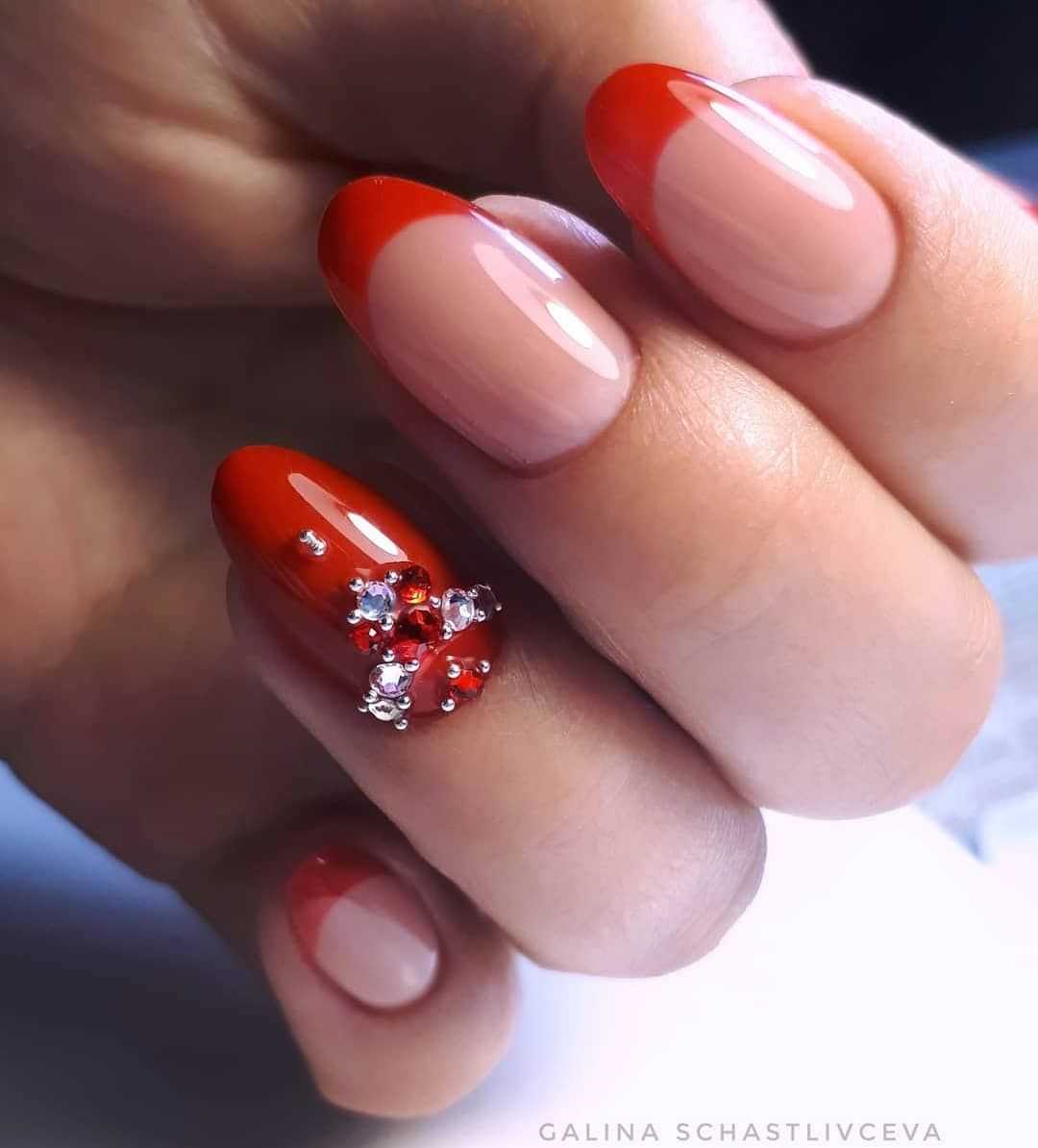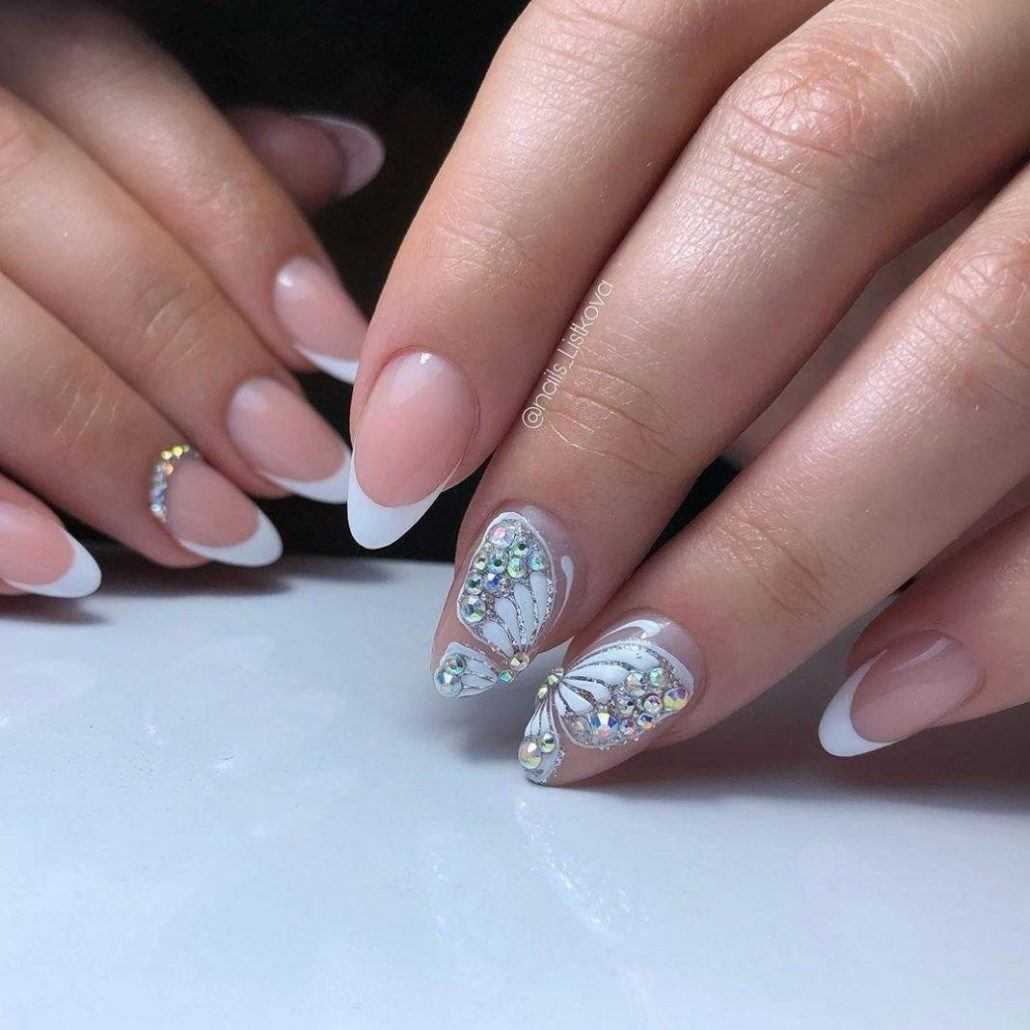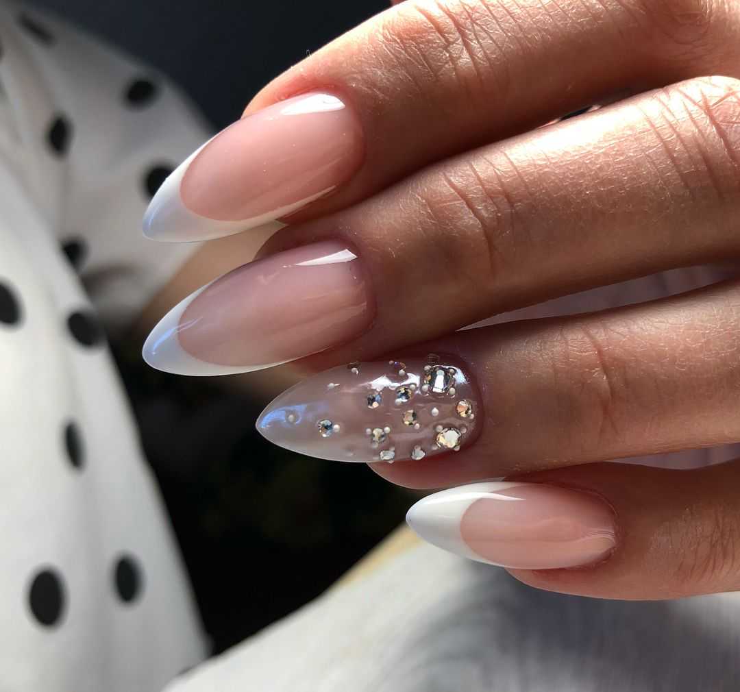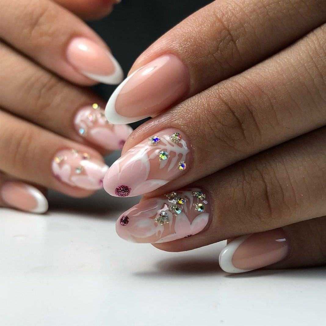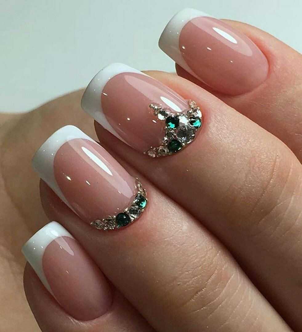 Блестки часто дополняют бульонками, стразами, камнями и другим объемным декором. В одном нейл-арте эти материалы смотрятся вполне гармонично и естественно. Если вы решили дополнить френч декором из страз, то отведите под него один из ноготков на руке. Это чаще всего безымянный палец. Его выбор вполне оправдан: безымянный палец реже используется в повседневном быту, при этом он практически всегда на виду.