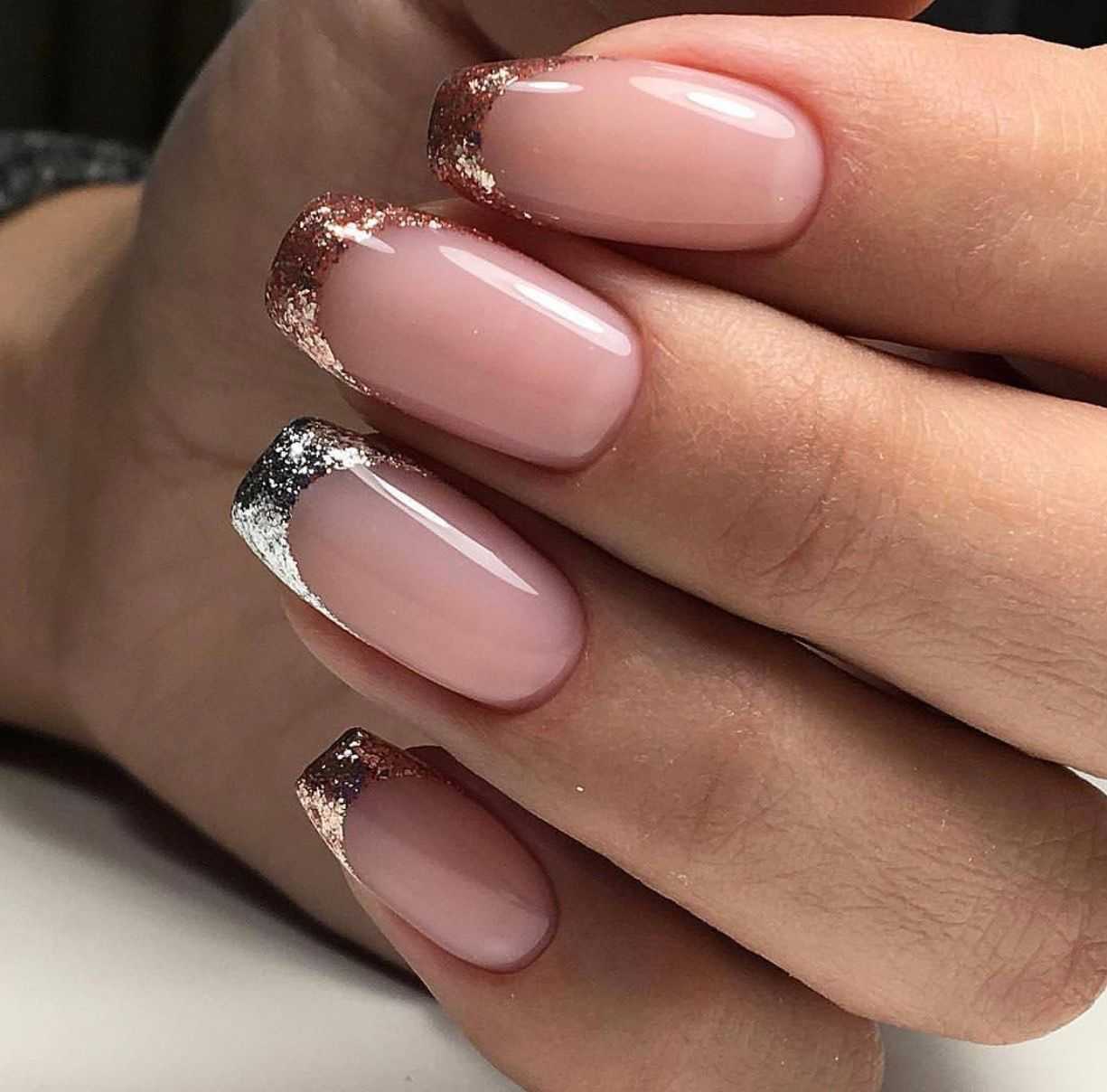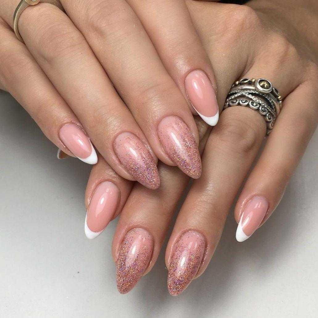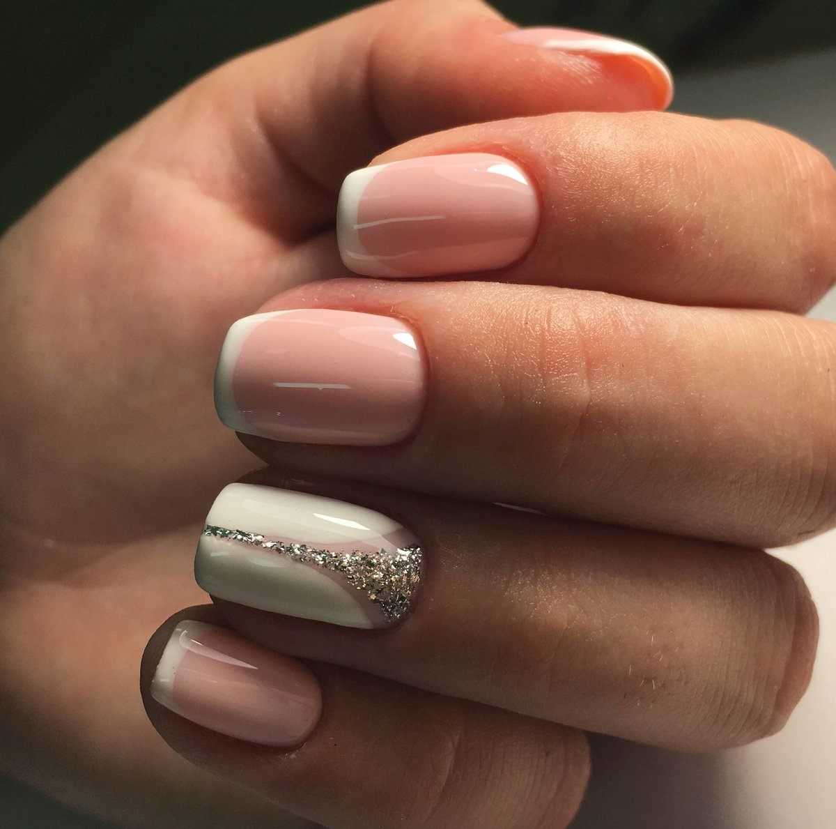 Блестки лучше всего вписываются в плавные линии френча, акцентируют внимание на ноготках, окрашенных в пастельные, едва заметные оттенки
