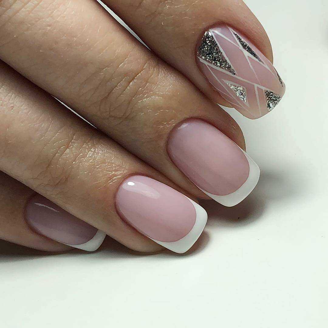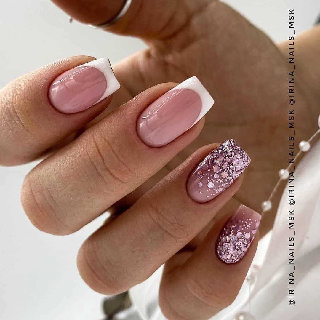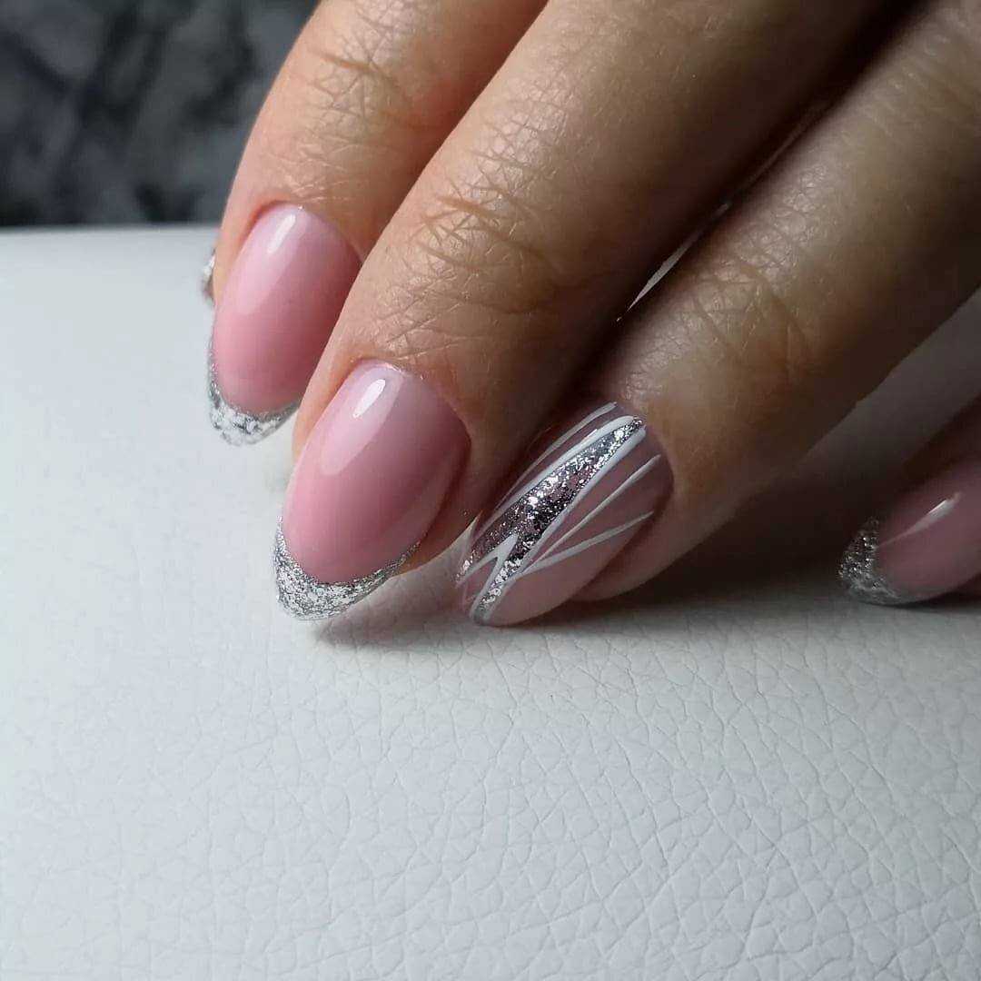 Блестки лучше всего вписываются в плавные линии френча, акцентируют внимание на ноготках, окрашенных в пастельные, едва заметные оттенки