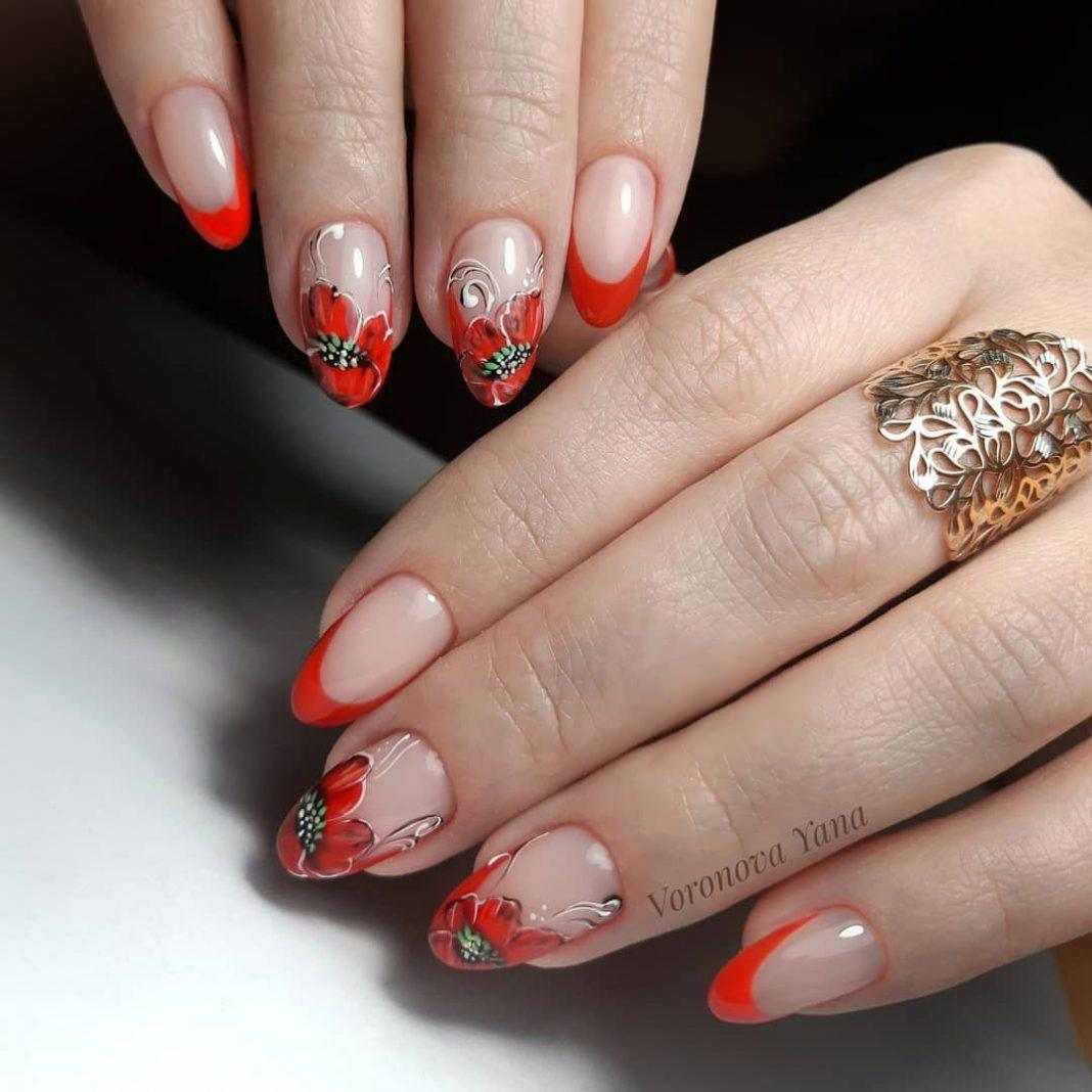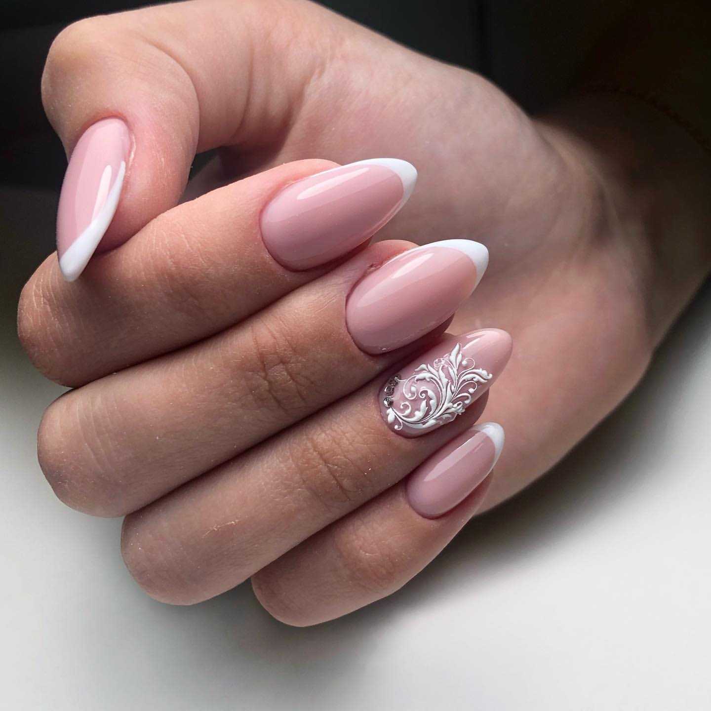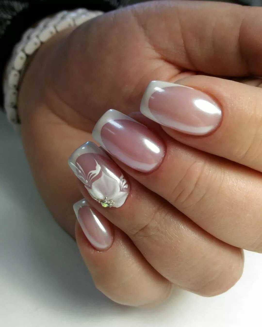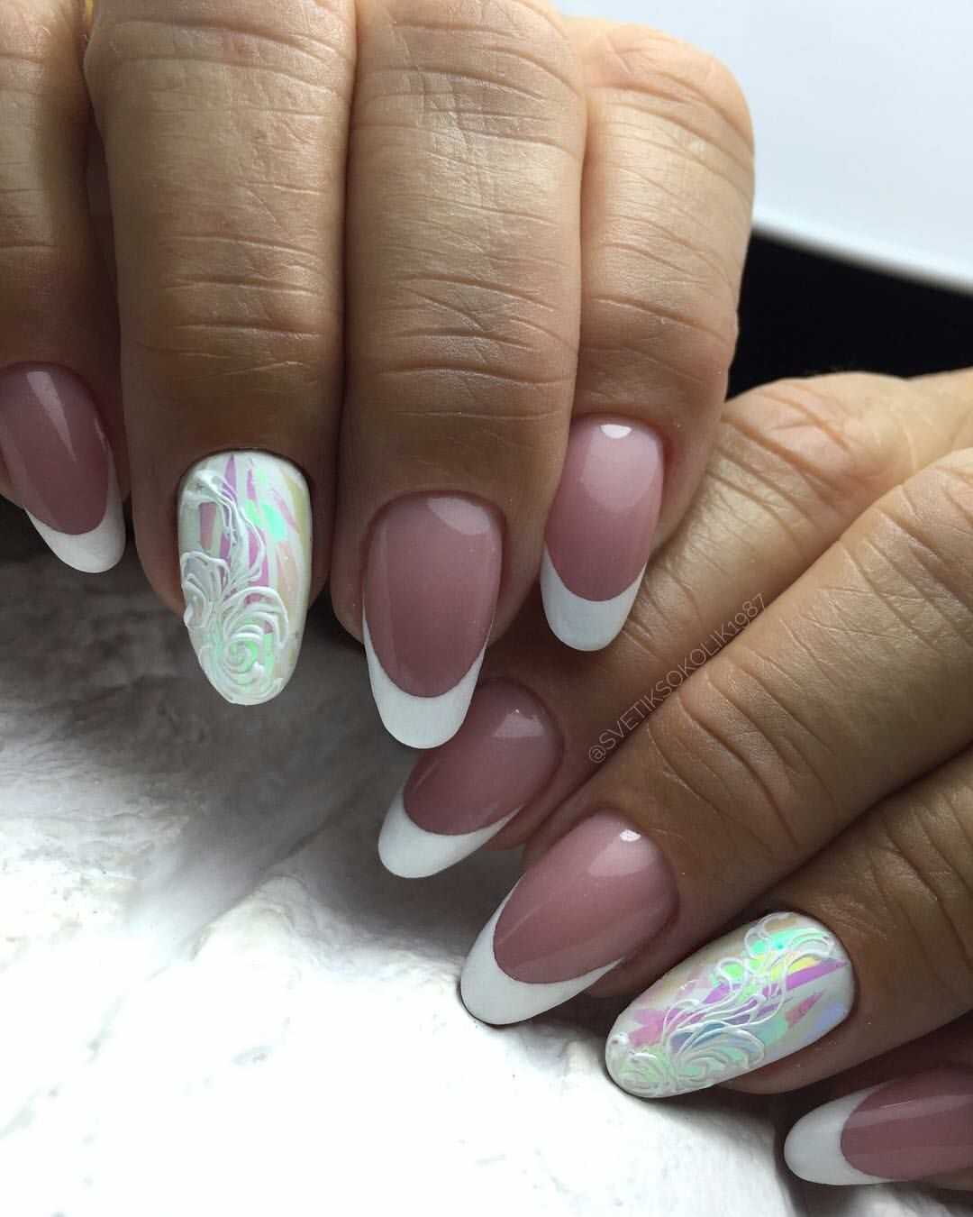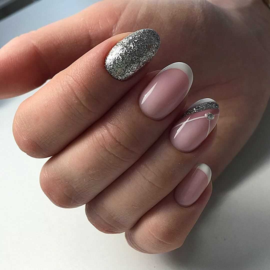 Эти оттенки великолепно гармонируют с серебряным глиттером, с жемчужной втиркой, с пайетками в форме сердечек или звездочек. Выполните классический френч с овальной или треугольной улыбкой и украсьте прикорневую зону блестящим декором. Что касается втирки, то под этот материал обычно отводится один из ноготков. Втирка отлично показывает себя именно на большом пространстве ногтевой пластины.