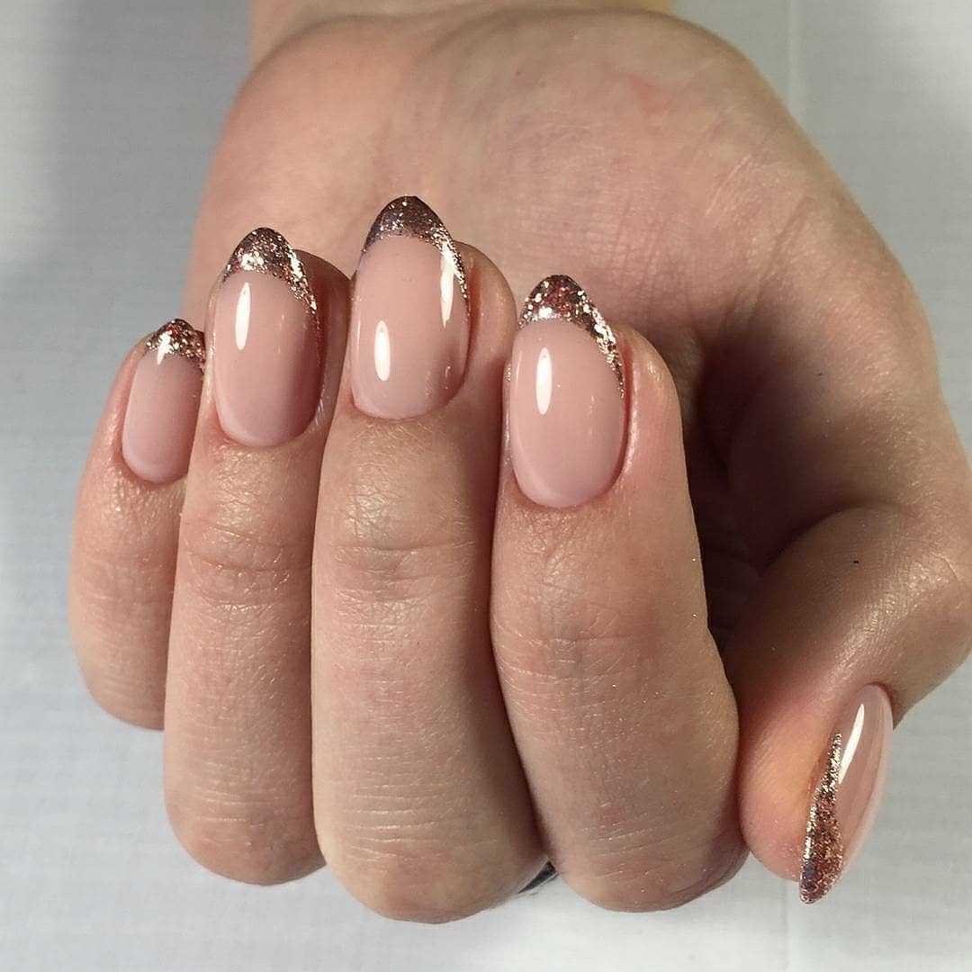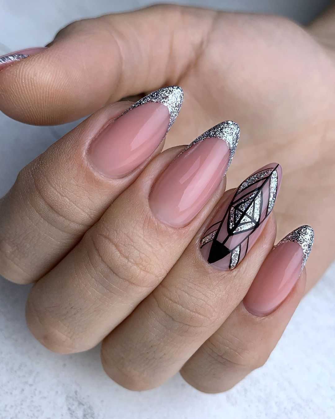 Мелкие блестки можно использовать как материал для рисования. С их помощью можно рисовать вензеля и завитки, заполнять лунки, прорисовывать линию свободного края. Французский маникюр с блестящим кончиком получается очень женственным и утонченным.