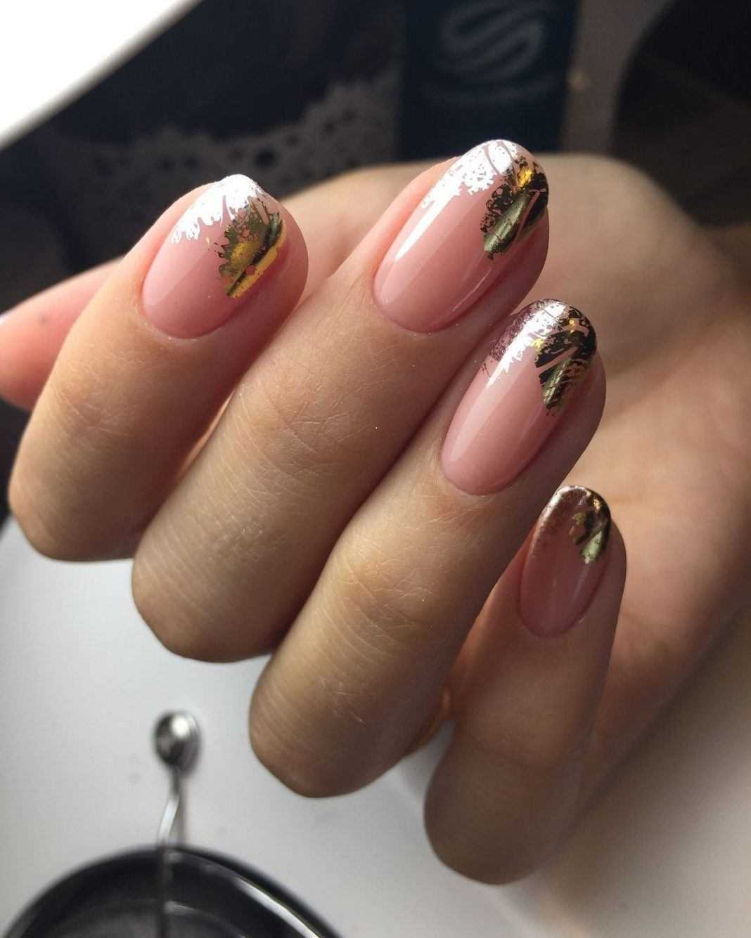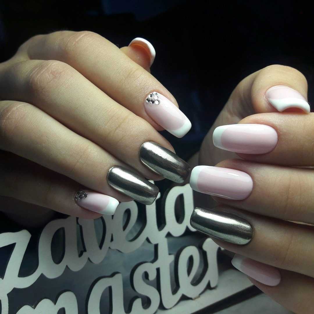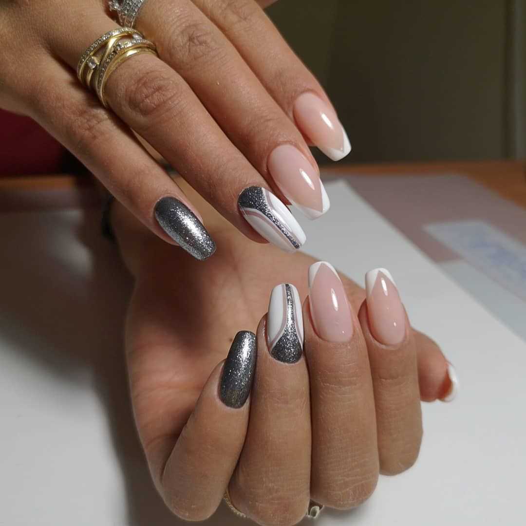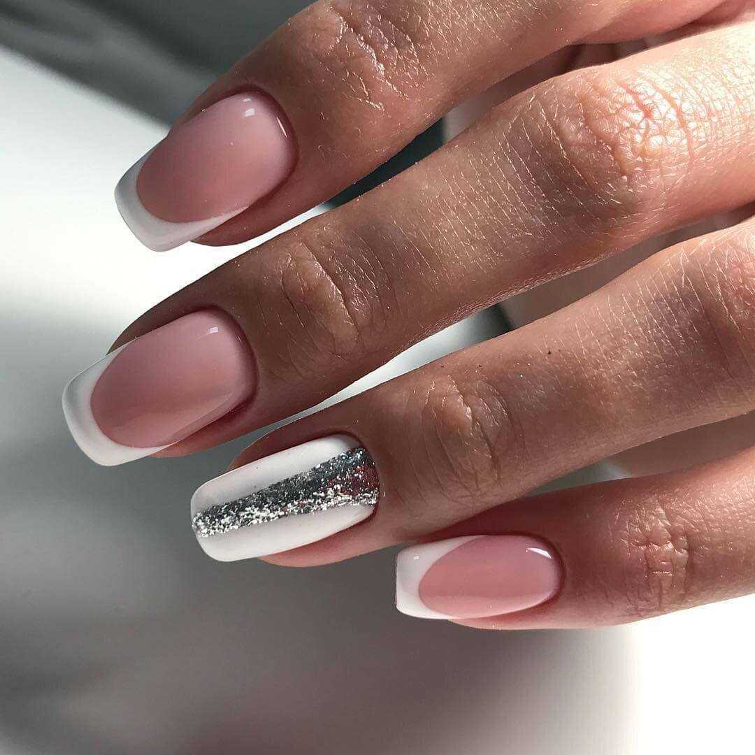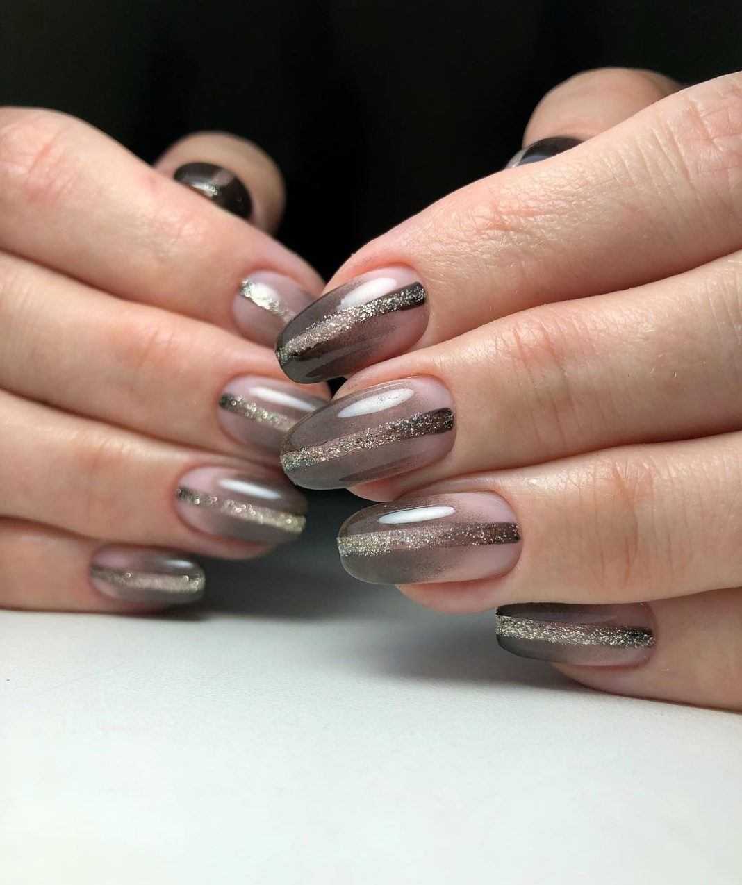 Вас интересует не столь яркий и кричащий, а, наоборот, более нежный маникюр с блестками? В таком случае, обратите свое внимание на белый, бежевый и серый цвет – светлый маникюр всегда смотрится более нежно и элегантно. Белый маникюр почти всегда дополняется серебристыми частичками, в случае с серым дизайном возможен также золотой и металлический глиттер