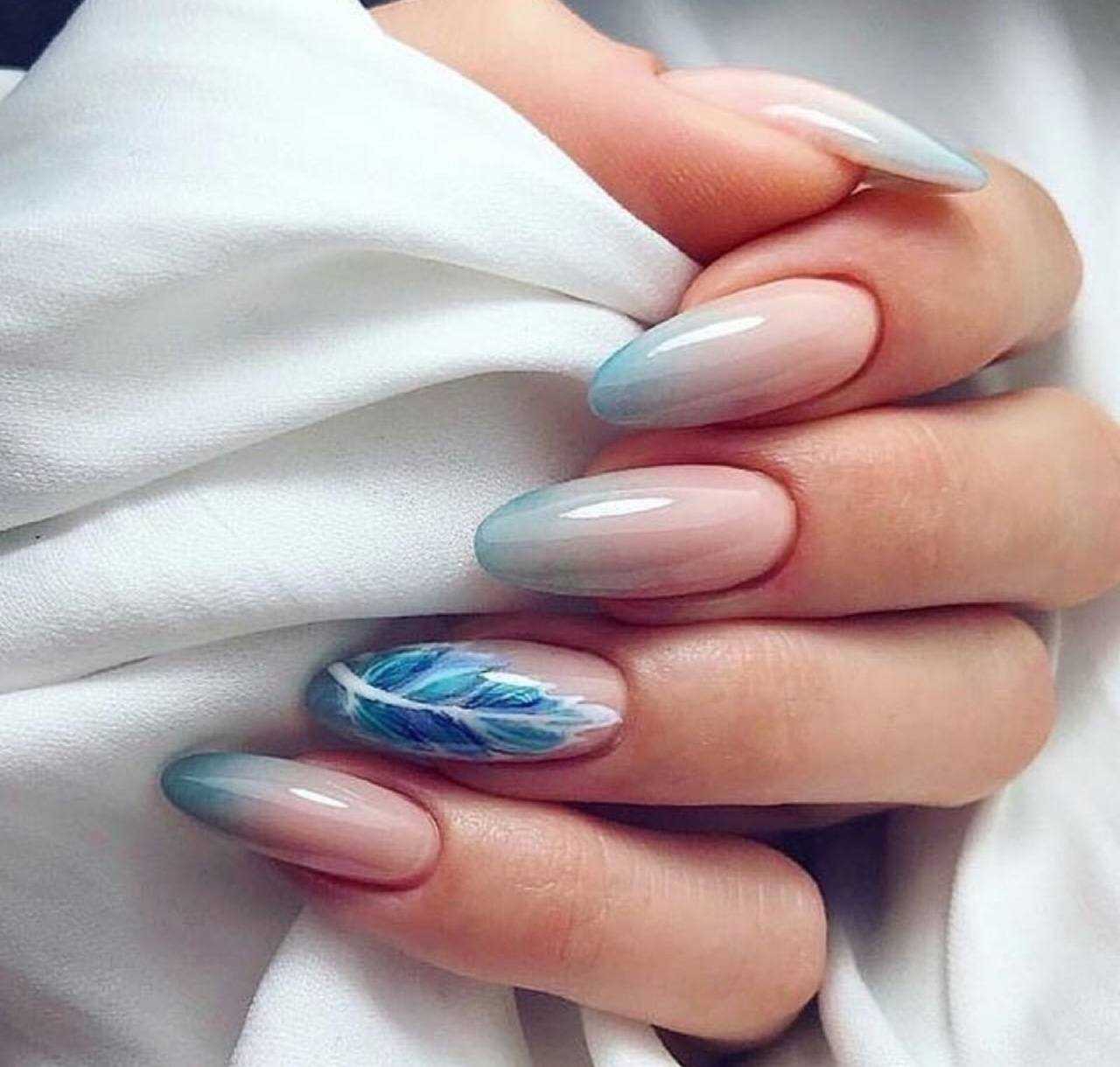 Великолепно выглядит нежно-голубой френч с блестками. Такой дизайн отлично впишется в летний образ, особенно если он дополнен узорами морской тематики. Голубой цвет также часто используется в зимних нейл-артах для имитации инея и морозной свежести.