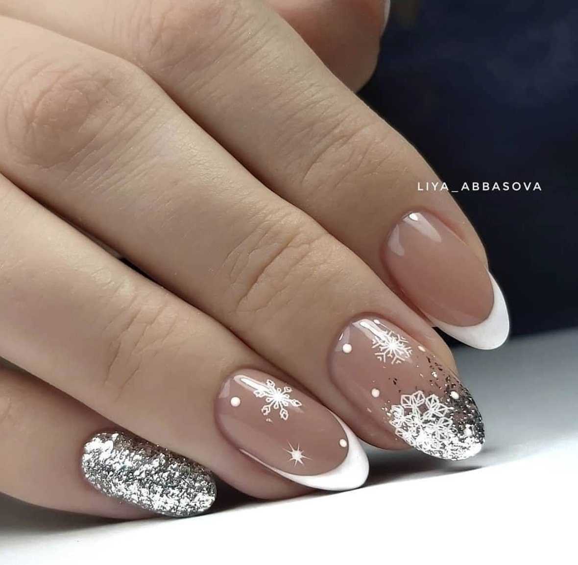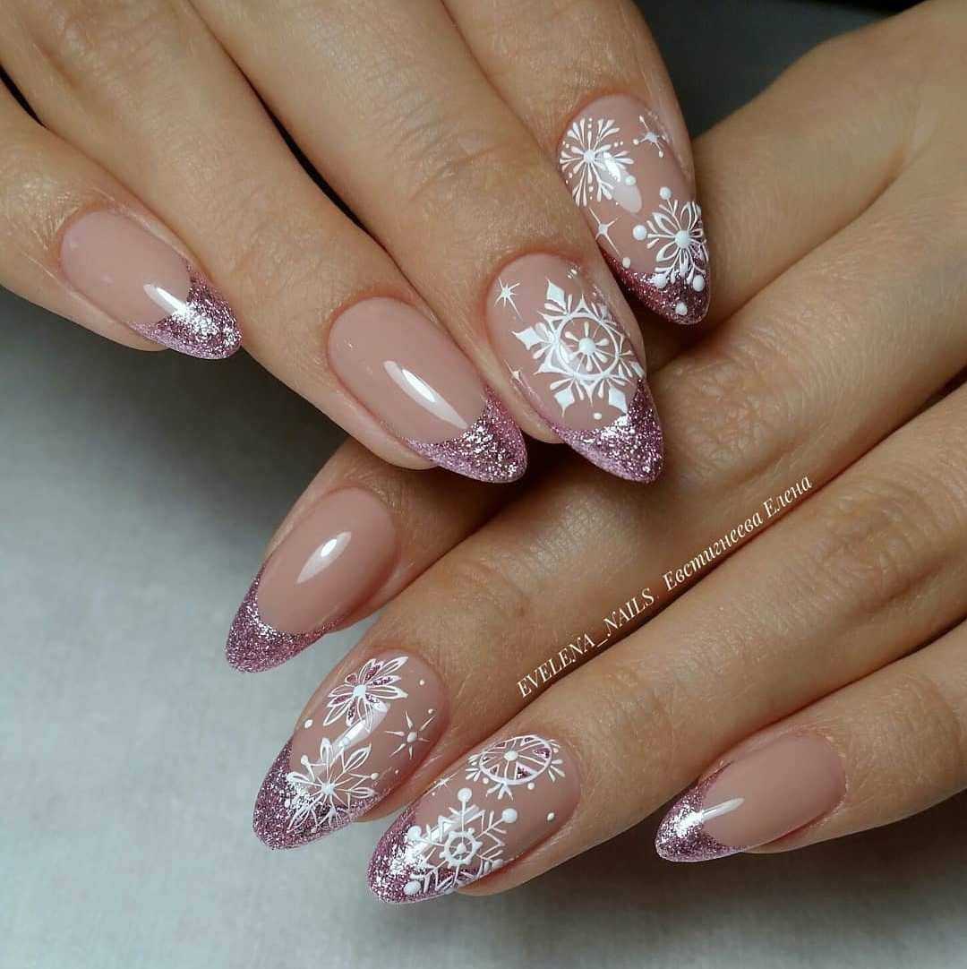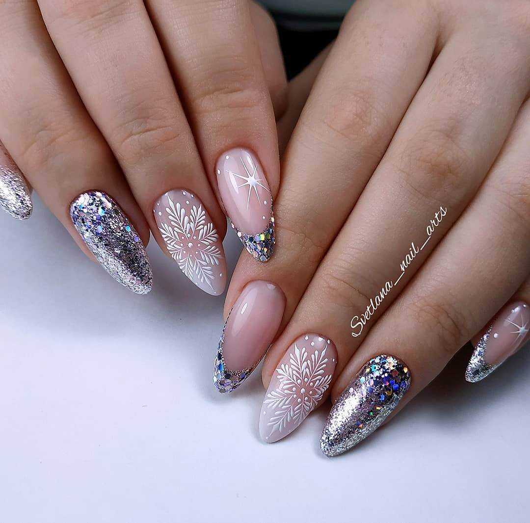 В тренде выкладка стразами узора в виде снежинки, звездочки, короны и т.д. Стразы можно расположить на однотонном фоне или использовать сплошное покрытие глиттером. Цвет блесток выбирайте в зависимости от основного оттенка стразов. Если вы решили использовать классические стразы на прозрачной или серебряной подложке, то выбирайте для декора серебряный глиттер.