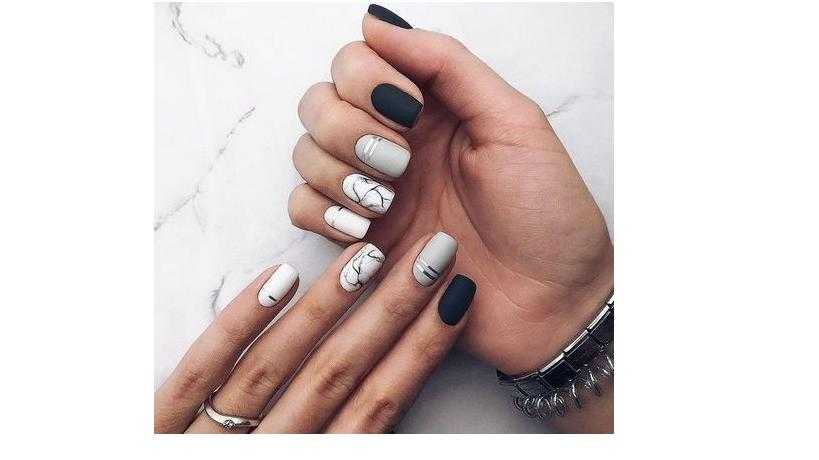 Давайте рассмотрим маникюр, в котором сочетаются матовый и блестящий гель-лаки, плавно меняющие оттенки от ногтя к ногтю. На большой и указательный пальцы нанесен матовый черный лак. Дальше взят модный светло-серый оттенок для среднего пальца и наклеено (известным читателю методом) две серебристые полоски. Безымянный палец и мизинец покрывают белым цветом.
