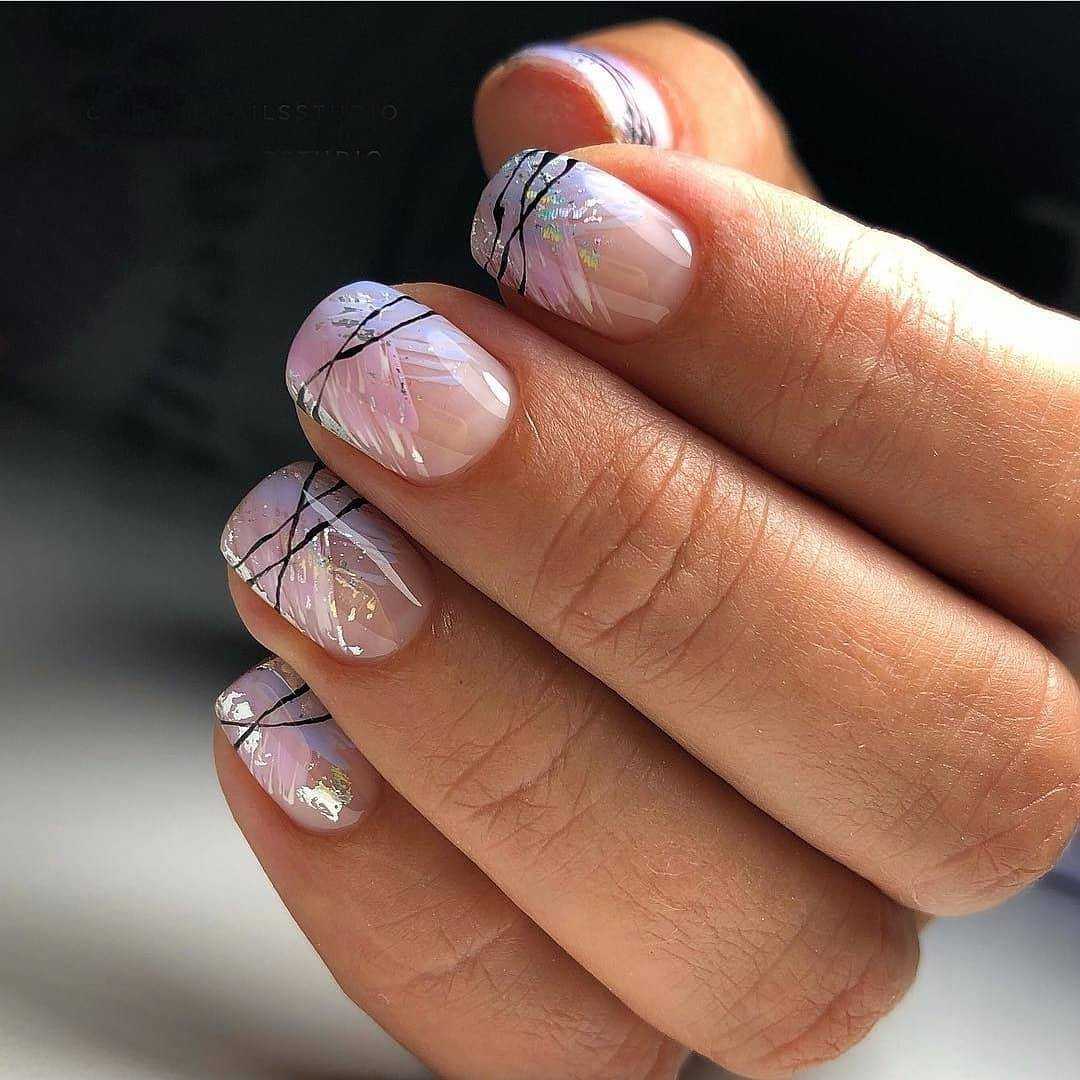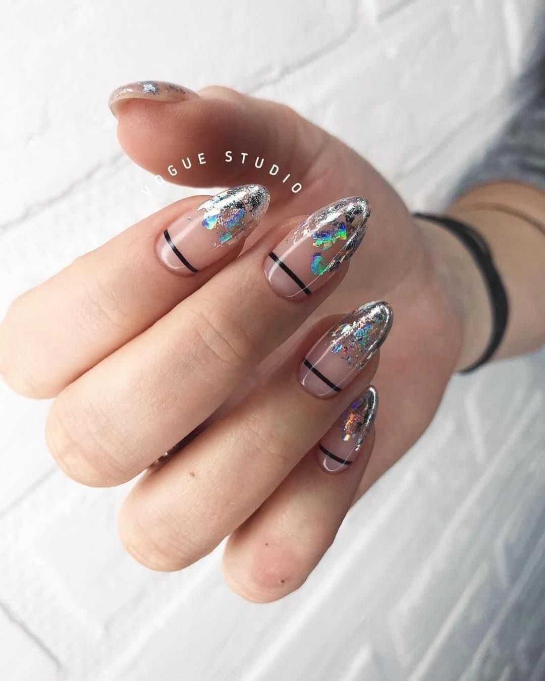 Чтобы сделать такой красивый маникюр с блестящими полосками, как на фотографии ниже, приготовьте бледно-розовый и черный матовый лаки. Такое цветовое сочетание необычайно популярно в нынешнем сезоне. Также купите бобины тонкой фольги серебристого и нежно-розового цветов.