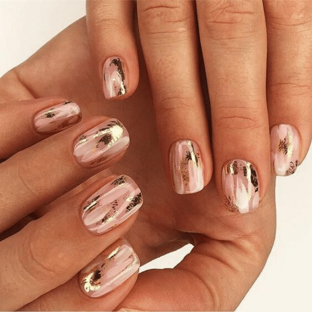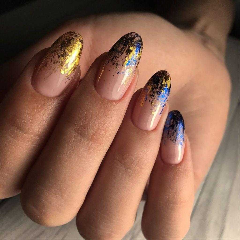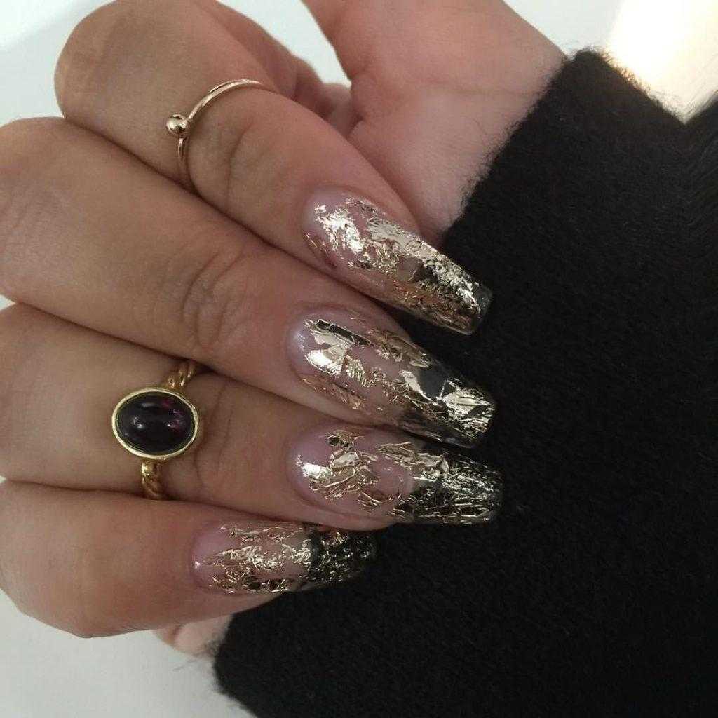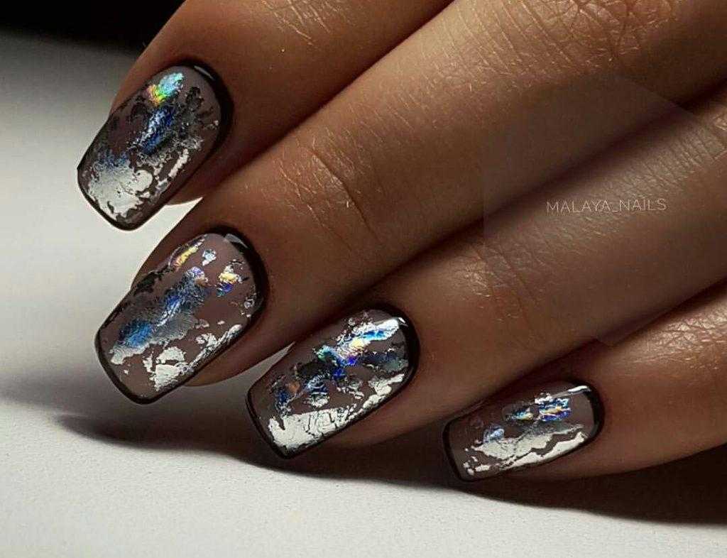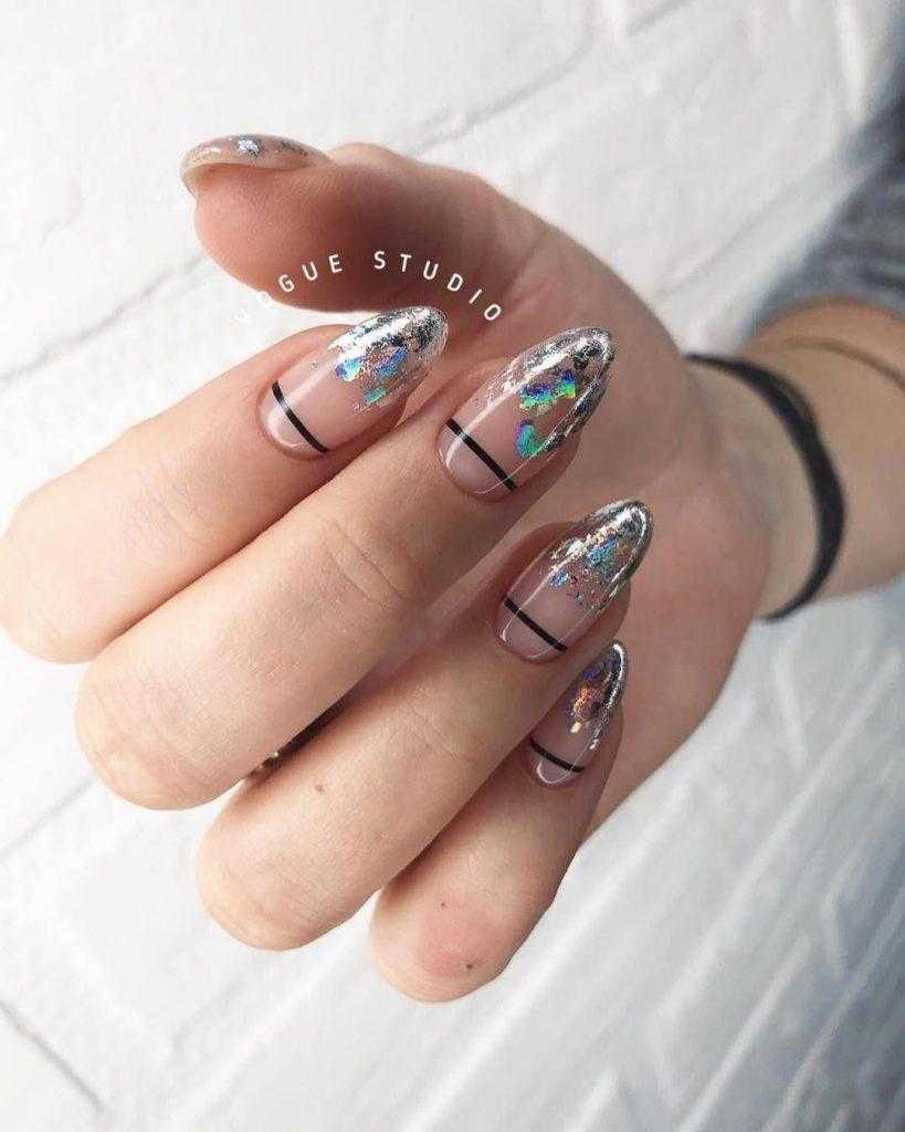 Фольгу применяют и как базовое покрытие (литьё), и как акцент. При этом она не выглядит как излишество – даже в сочетании с рисунками или стразами. Предпочтительная форма ногтей для такого дизайна миндалевидная или овальная, а длина ногтей – средняя.