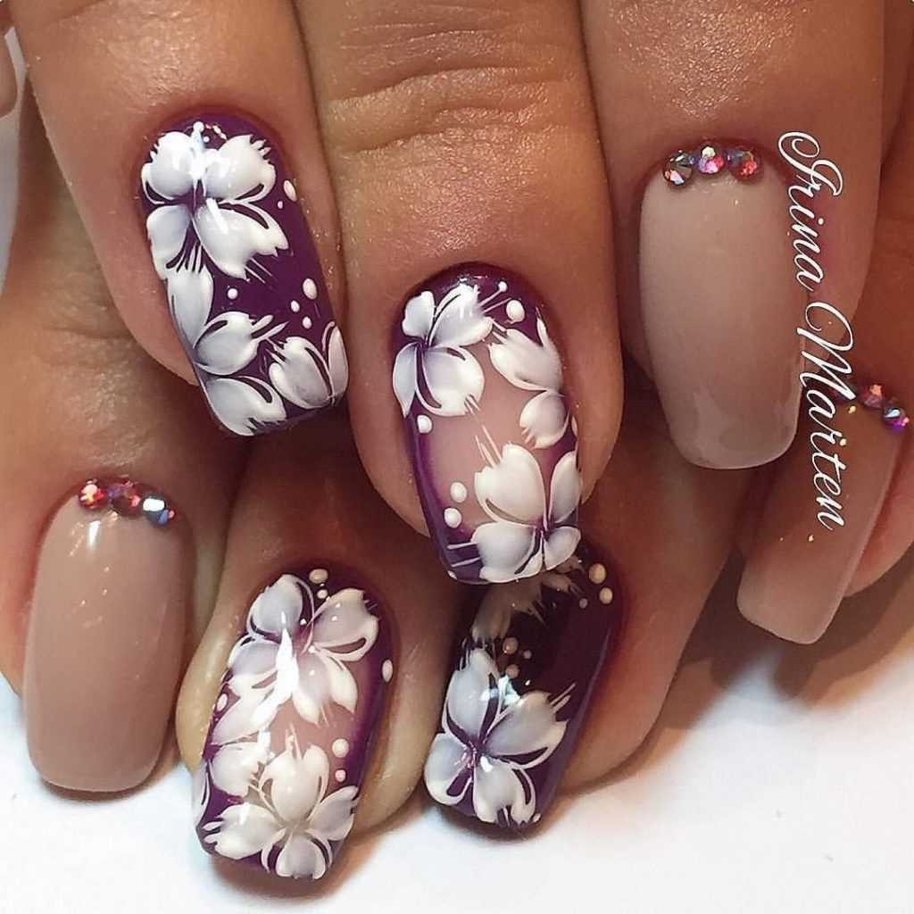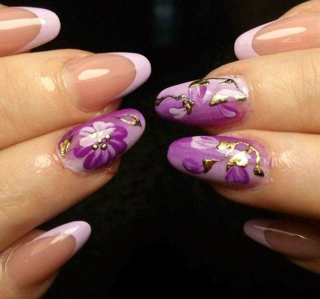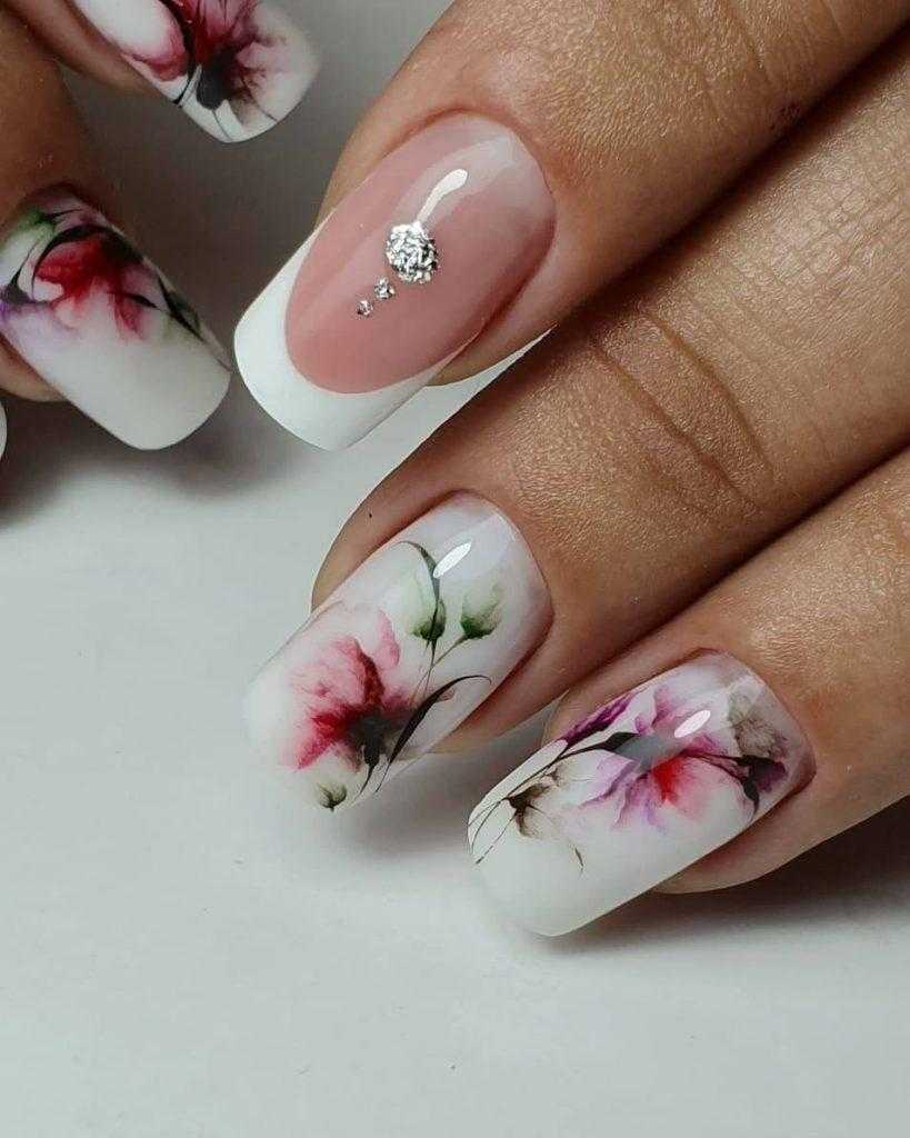 Это уже не минималистичный, а вполне полноценный сложный френч. Цветы рисуются или используются готовые аппликации на ногтевую пластину. Тон или покровный слой полностью бесцветный или чуть подкрашенный.