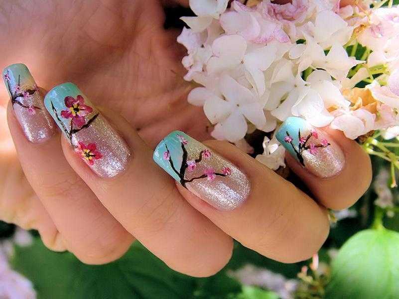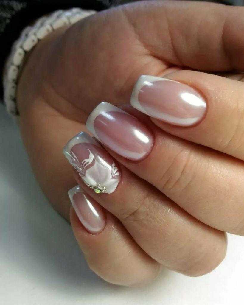 Наиболее востребованным сегодня является французский вариант нежного маникюра. Под него рекомендуем наложить нежно-розовую базу. Характерные для френча полоски на кончиках ногтей дополните тонким кружевом или изящными завитками. Здесь прекрасно подходят стразы умеренного формата или серебристый глиттер. Классический френч будет выглядеть свежо и оригинально, если умело украсить его цветами, бабочками или, например, веточкой сакуры. Для рисования используйте стемпинг или специальную кисть.