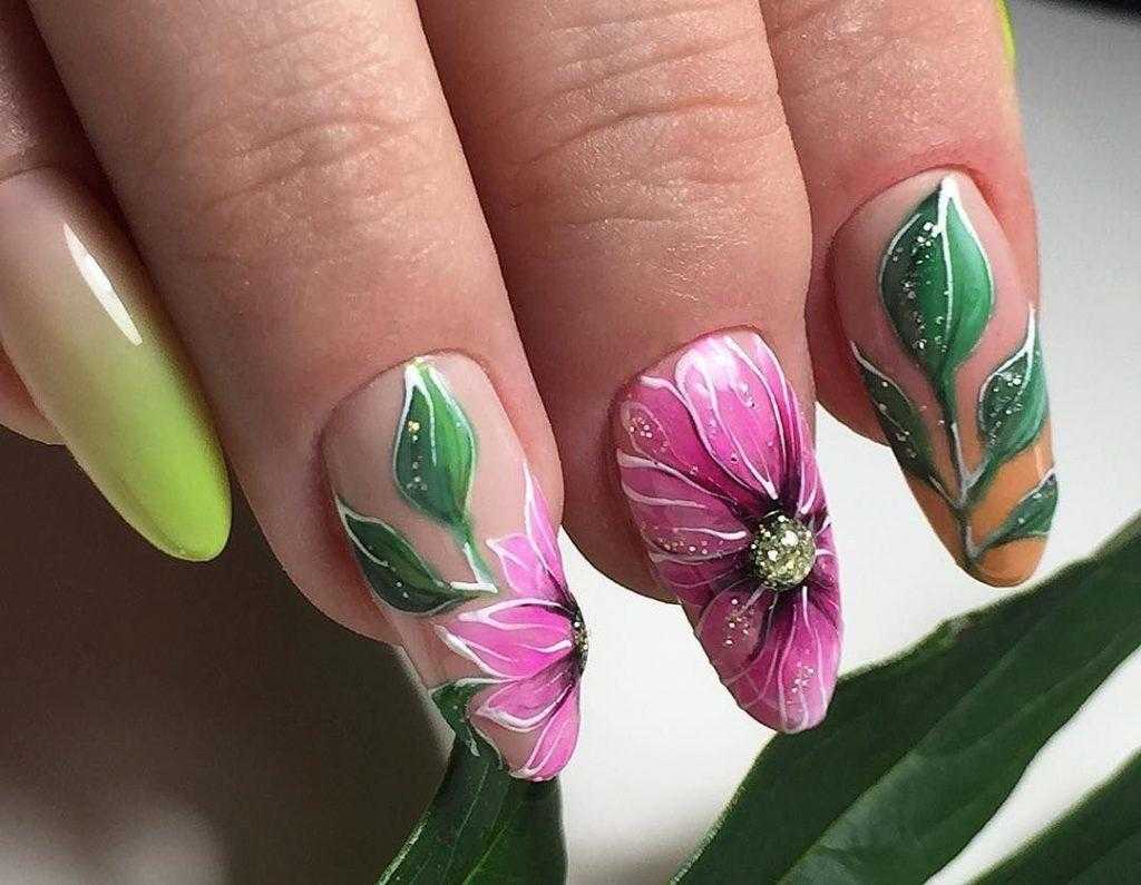 - Интересный вариант – различная цветовая палитра на каждом ногте. Цвета могут быть гармоничными, плавно переходя от одного оттенка к другому. А можно создать и более дерзкий образ, выбрав абсолютно противоположные цвета (например, нежные, постельные и яркие, тёмные).