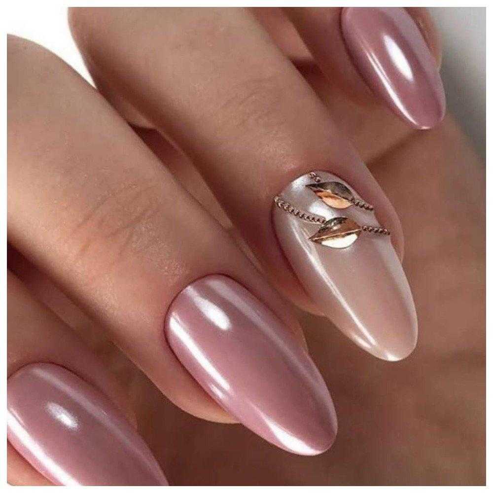 Маникюр на короткие ногти, выполненный по технологии жемчужной втирки, смотрится очень изящно и аккуратно. Отлично впишется в повседневный образ, подойдёт и для работы в офисе, и для деловой встречи, и для прогулок с друзьями.