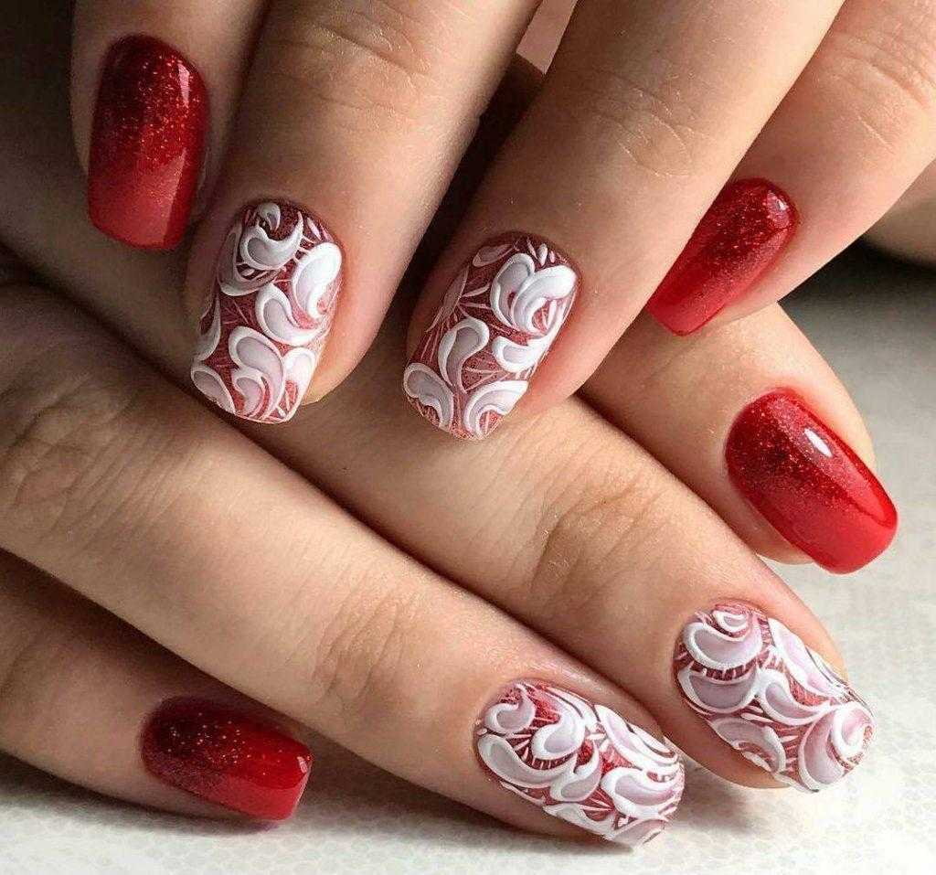 Многие модницы с некоторым недоверием относятся к сочетанию красного лака и втирки, считая подобный дуэт слишком броским. Однако, мы спешим вас заверить, красные ноготки с блестящими переливами смотрятся никак не ярче любого другого оттенка. Наоборот, сияние втирки в некотором роде сглаживает насыщенность основного цвета и дополняет оформление нотками загадочности. Как и в примере с чёрным покрытием, пудра может использоваться для преображения всех ногтевых пластин, а может выделять переливами или космическим сиянием лишь несколько пальцев. Также очень симпатично и оригинально смотрятся комбинированные варианты маникюра, в которых помимо красного лака присутствуют другие оттенки и элементы декора, например, белый лак, стразы, камифубуки или блёстки глиттера.