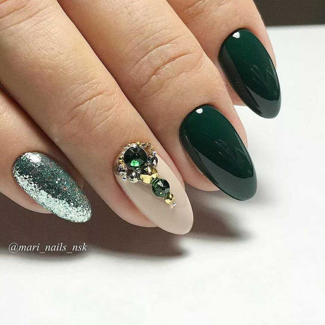 Несмотря на тенденции нейл-арта, зеленый маникюр довольно часто украшают стразами и камнями небольшого размера. С их помощью можно сделать имитацию ювелирных украшений, что смотрится невероятно красиво. Такое оформление выбирают преимущественно для праздничных мероприятий. Ведь маникюр становится настоящим украшением и одним из акцентов образа.