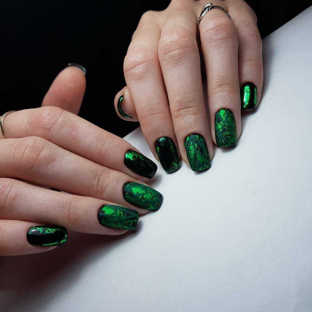 Для зеленого маникюра с эффектом “битого стекла” используют маленькие частички голографической пленки. Вариант с оттенком бутылочного стекла напрашивается сам с собой.