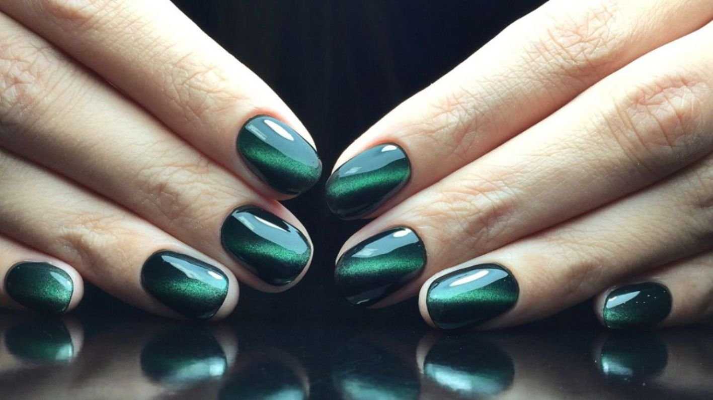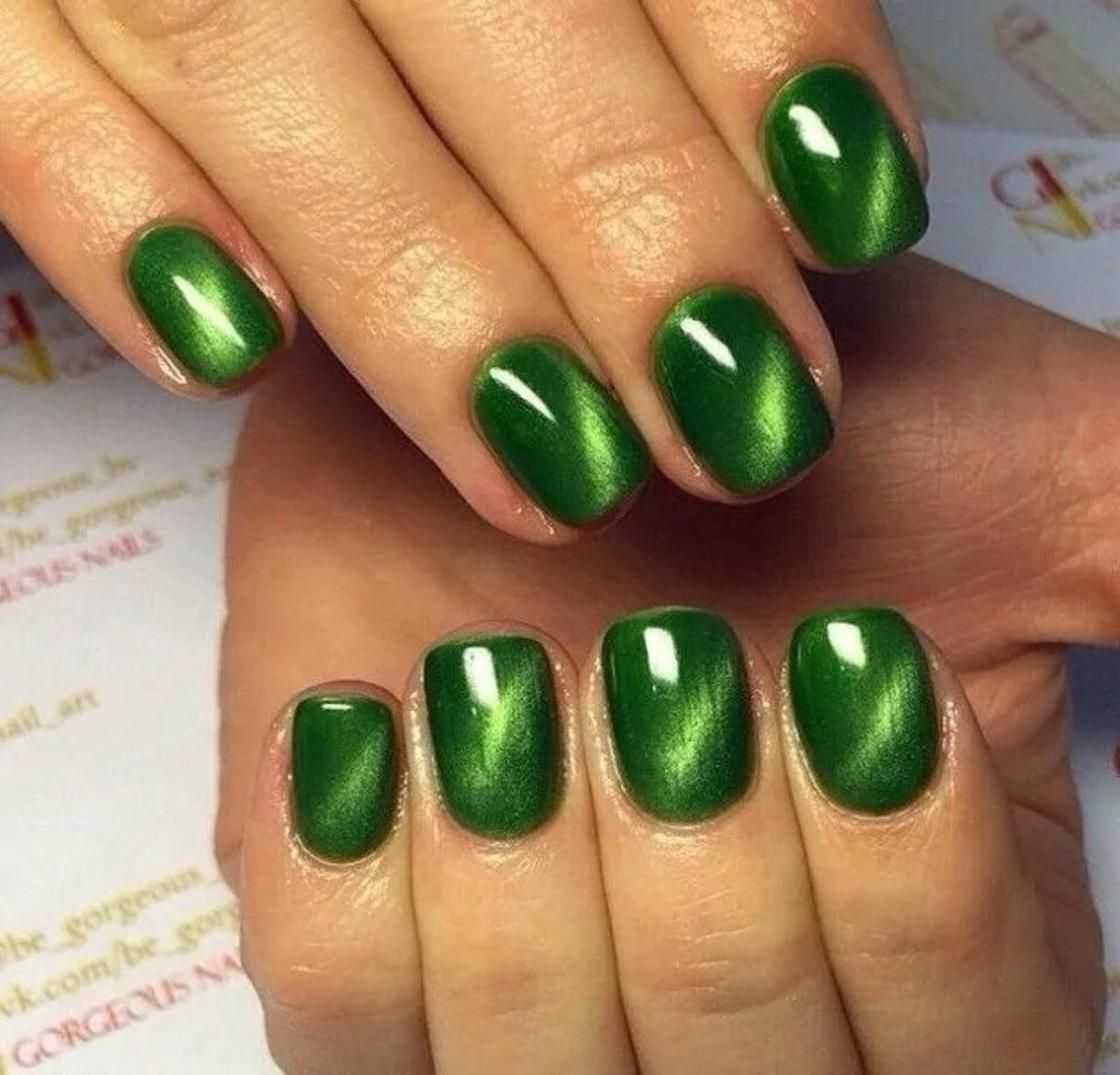 Гель-лаки с эффектом «кошачий глаз» используются и в однотонных покрытиях, и с сочетанием разных текстур. Особенность этого эффекта кроется в его необычных бликах и глубоком тоне. Зеленое покрытие с переливами в 2022 году дополняется: