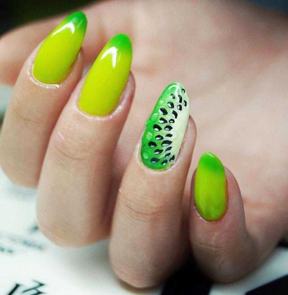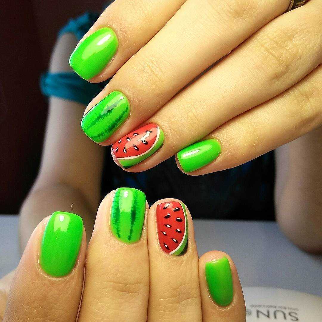 • салатовый с тёмно-зелёными клейкими лентами – создание на ногтях подобной абстракции при помощи кислотной яркой основы и чётко очерченных клейких линий в насыщенном буром цвете смотрится очень броско и приметливо. Подобная красочность чаще применяема на длинные острые или квадратные ноготки, что позволяет создать с помощью лент чётко очерченный прямыми линиями френч или подобие из ромбовидной или квадратной клети на ногтях в перпендикулярном пересечении имитированных прямых;• арбузный маникюр – достаточно модное и яркое решение в виде маникюра с рисунком из арбузной кожуры пришлось по душе очень многим представительницам прекрасной половины; своим необычным, но сочным видом такой дизайн не может не вызывать интерес и любопытные взоры окружающих. Актуально выполнять подобное художество в мате и добавлять сверху такого покрытия мелкие глянцевые капли прозрачного геля, имитируя тем самым ещё большую свежесть и практически передавая запах свежевымытого арбуза;• травяной дизайн – высаженные в плотном густом покрытии травяного цвета ворсинки смотрятся на ногтях очень стильно и молодёжно. Вместе с надетым модным свитером-травкой в любом его цветовом решении такой маникюр будет смотреться ещё более акцентированно и уместно – эдакий свежескошенный газон прямо на ноготках современной модницы.