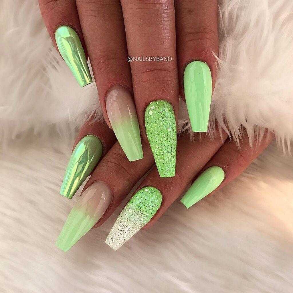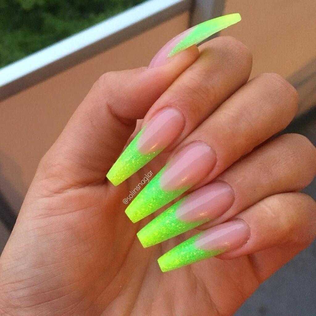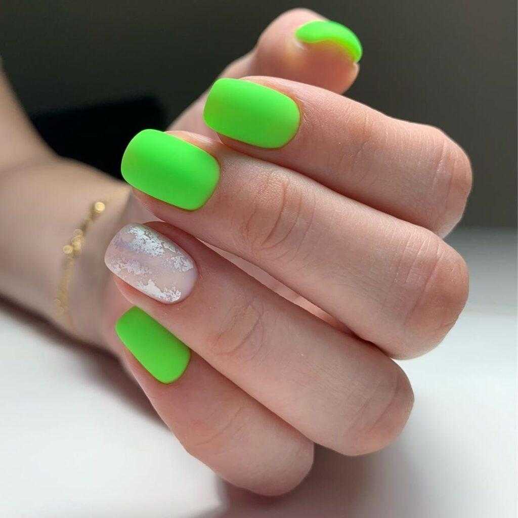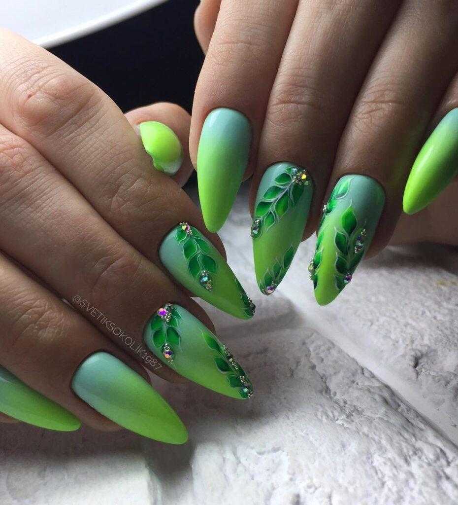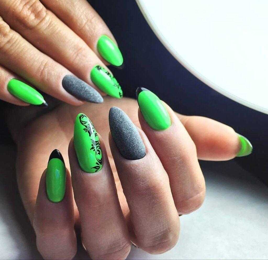 При правильно подобранном оттенке или их комбинации, а также удачном выборе декора все ярко-зелёные тона легко подстраиваются под ноготки разной формы.