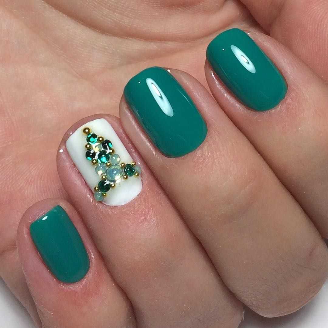Естественное и гармоничное дополнение к зеленому маникюру. Стразы бриллиантового или изумрудного оттенка, золотистые или радужные – подойдут любые. С размером тоже допустимо любое разнообразие. Возможно, всю жизнь мечтая о кольце с изумрудом, вы вдруг «позволите» его себе как роскошную отделку на ногте. В зеленом цвете очень эффектно дополнить камушками восточный орнамент.