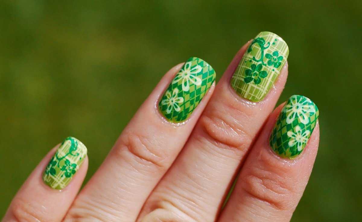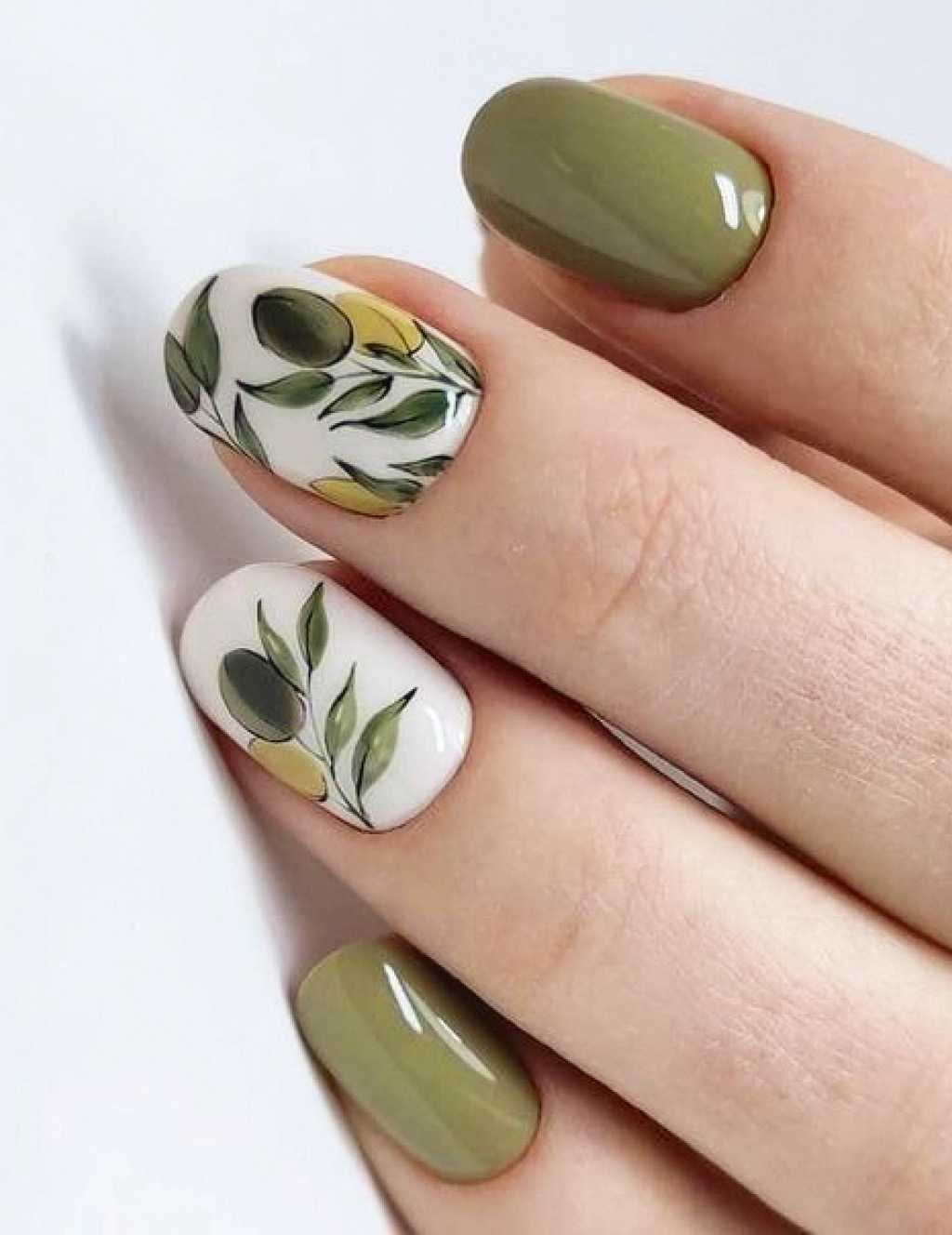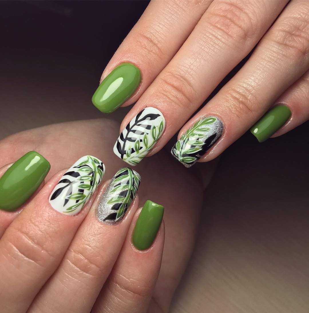 Зеленый маникюр, дополненный рисунком, мгновенно становится более интересным. Самыми трендовыми идеями изображений стали три тематики: