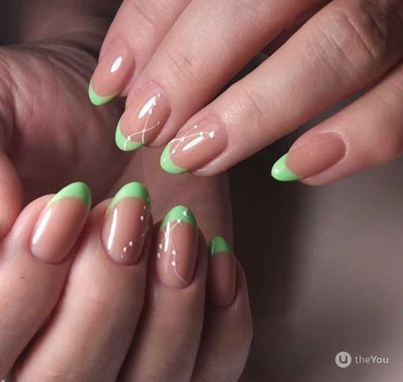 Интересная дизайнерская находка – так называемый лунный маникюр. С добавлением светло-зеленого декор не потеряет легкости и беззаботности. Для гармонии старайтесь подобрать цвета идентичной или контрастной температуры.