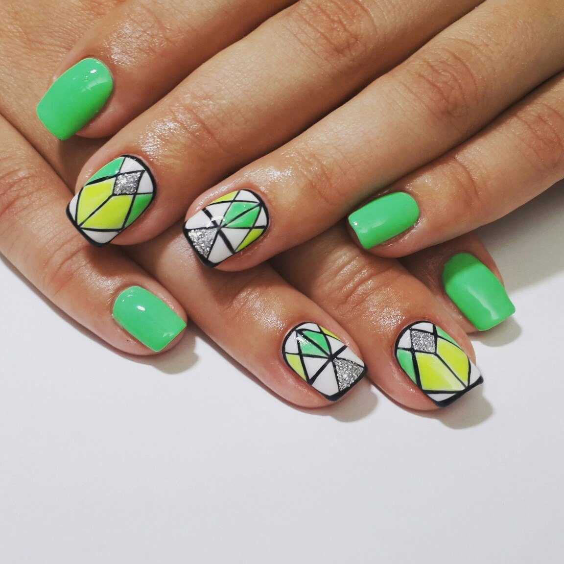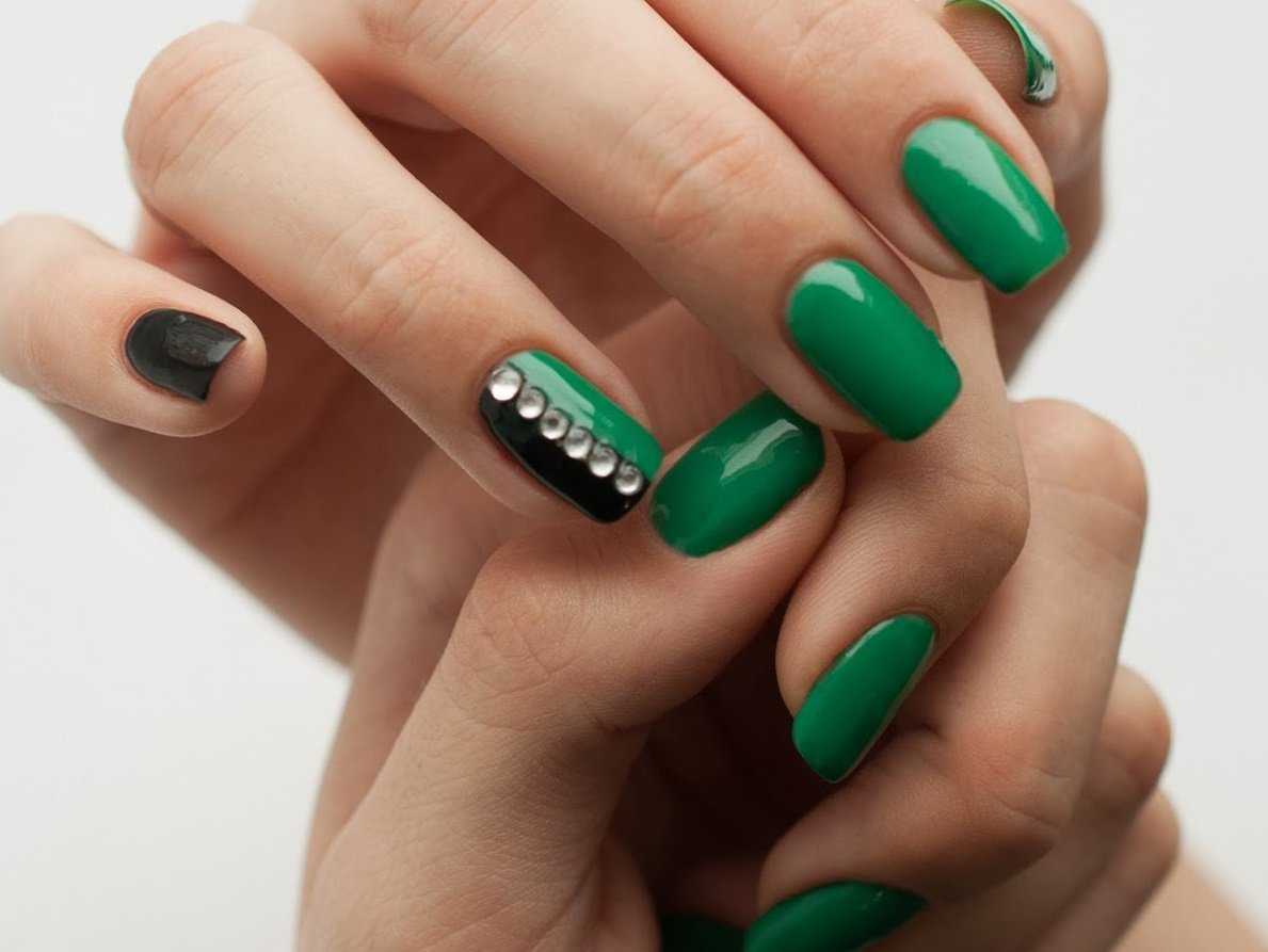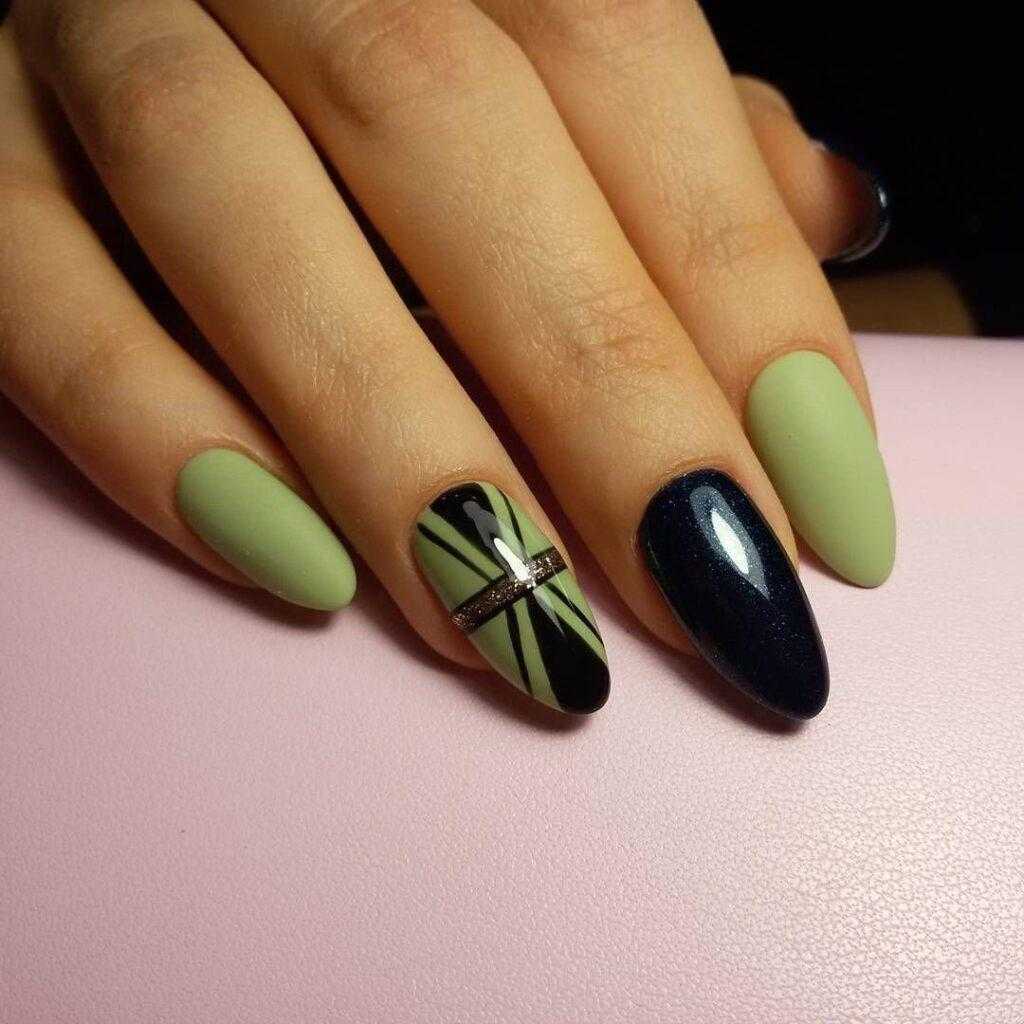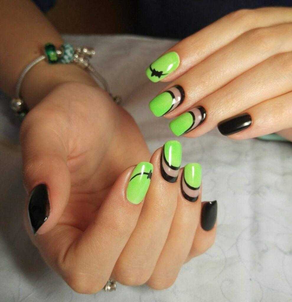 Великолепно выглядит сочетание разных оттенков зеленого с черным. Можно «поиграть» с цветовым дизайном, используя геометрические узоры, полосы, покрытие отдельных ноготков разными цветами.