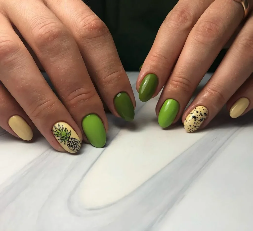 Для летнего зеленого маникюра больше всего подойдет оттенок молодой травы и нежный приглушенный ментоловый. Такой маникюр просто немыслим без рисунков фруктов: