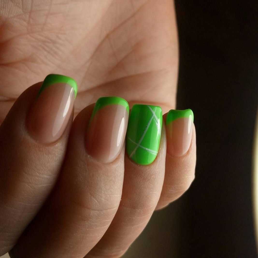 Очаровательно и кокетливо на одноцветном покрытии можно расположить горошинки или бусинки зеленого и других цветов. Очень эффектным решением станет разноцветный геометрический узор на ногтевой пластине. А цветной френч, пожалуй, самое лучшее решение для весеннего или летнего маникюра. Стильно и ярко заявят о себе неоновые оттенки зеленого цвета, которые могут даже светиться в темноте.