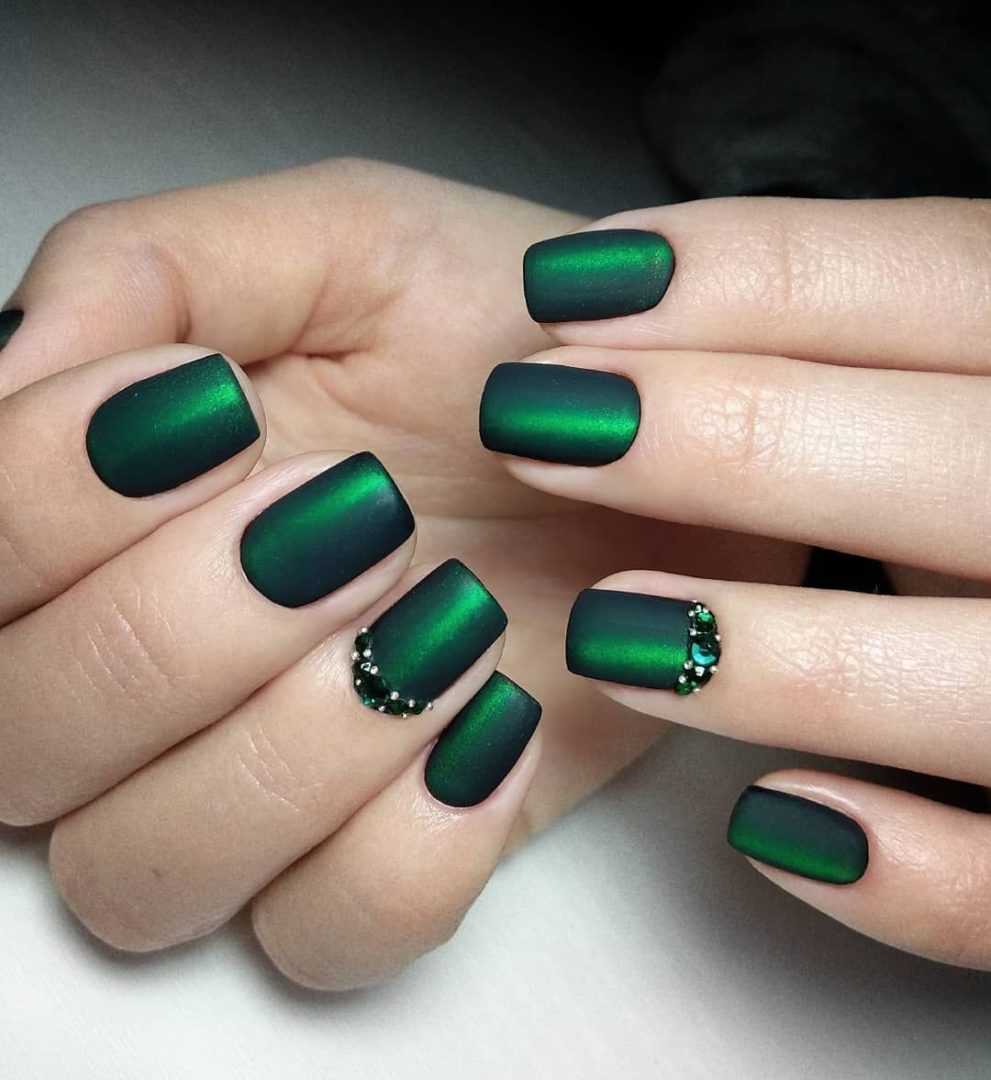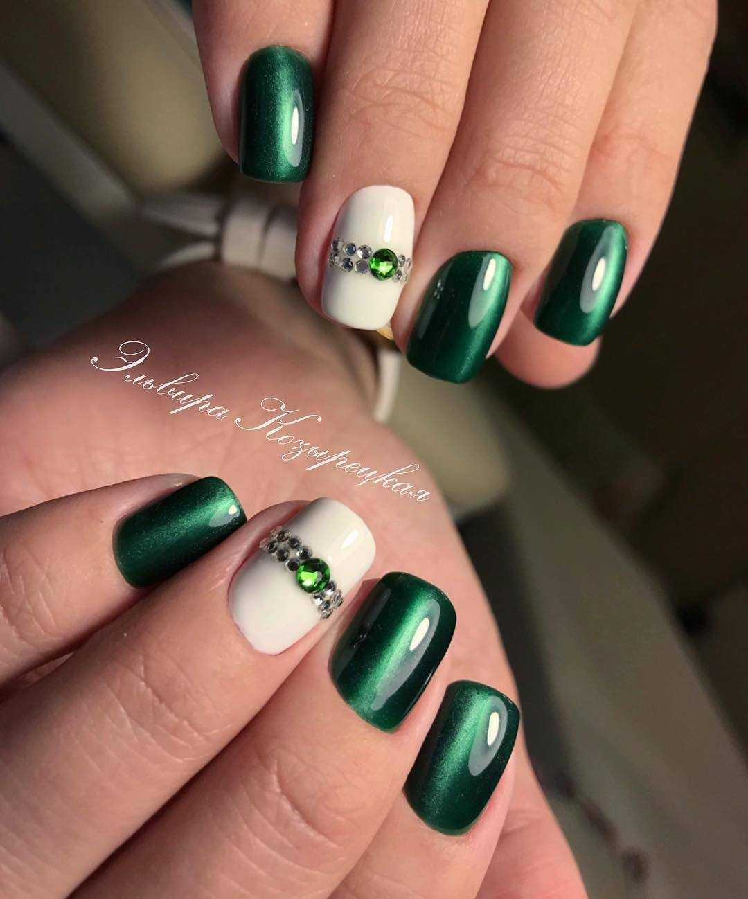 Насыщенный оттенок изумрудного идеально подходит длинным ногтям и средней длины, особенно в матовом исполнении. В тренде использовать данный оттенок с эффектом «кошачьего» глаза. Красивые дизайны получаются с использованием магнитного лака. Глубокий изумрудный отлично сочетается с черным лаком, его удачно украшать жидкими камнями.