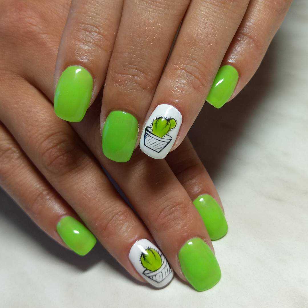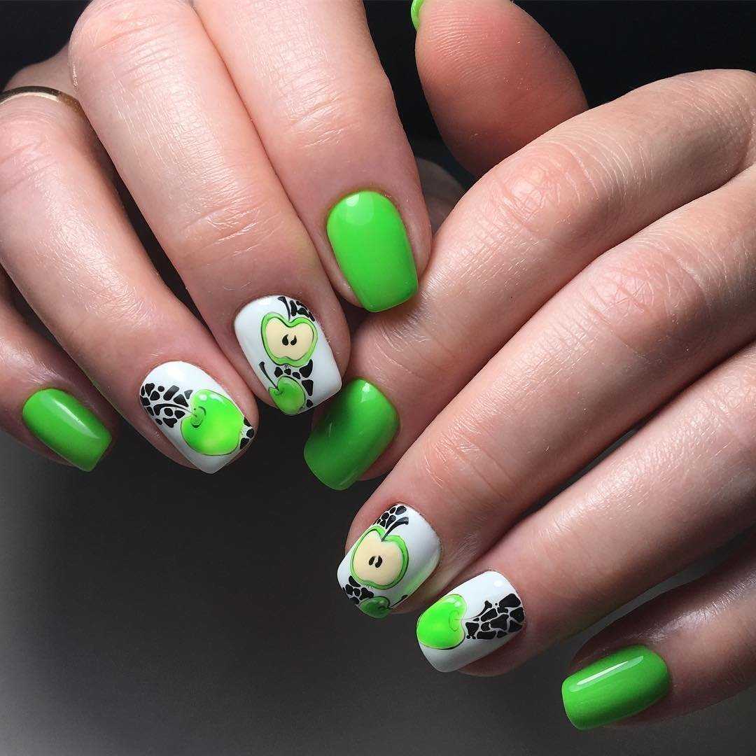 Насыщенный травянистый маникюр превосходно гармонирует не только с рисунками фруктов, но и со стемпингом, геометрией, растительными мотивами. К примеру, очень интересно будут смотреться пальмовые ветви или листья монстеры.