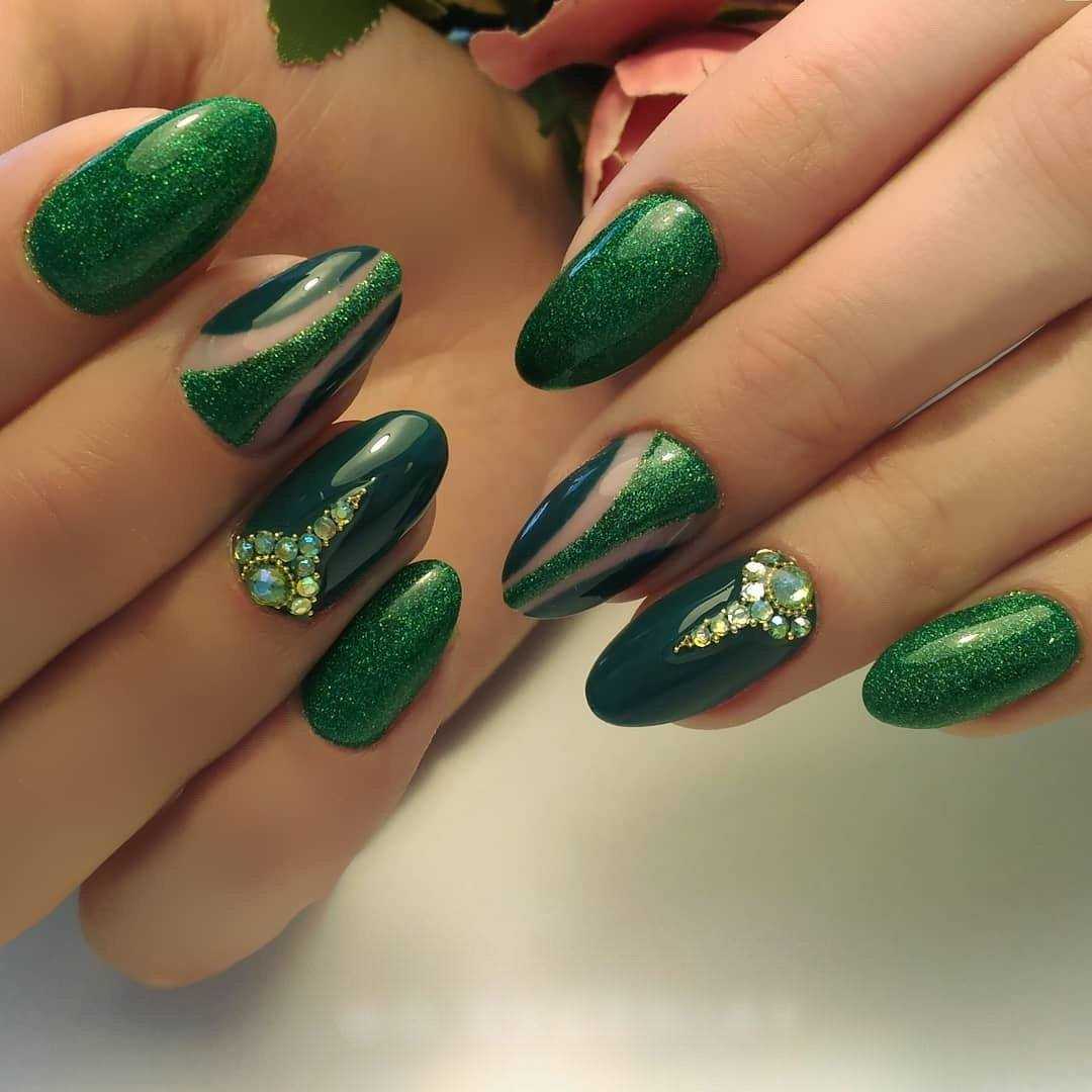 Идеально сочетаются зеленые ноготки насыщенных оттенков с разными видами дизайна золотистого и изумрудного цвета, таких, как блестки, стразы, камни, фольга, кракелюр. Каждая обладательница красивых ноготков обязательно подберет себе гармоничную пару по душе.