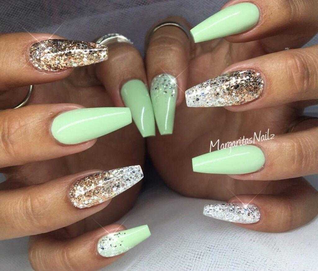 Великолепное решение – от крупных конфетти до блеск-пудры. Многие выбирают сдержанный блеск на некоторых участках или один-другой блестящий ноготок на руке, но присмотритесь к блеску на кончиках ногтей. Конечно, к глубокому зеленому больше подойдет бронзовый, золотой отлив. А мятный цвет благородно и свежо заиграет в сочетании с серебром.